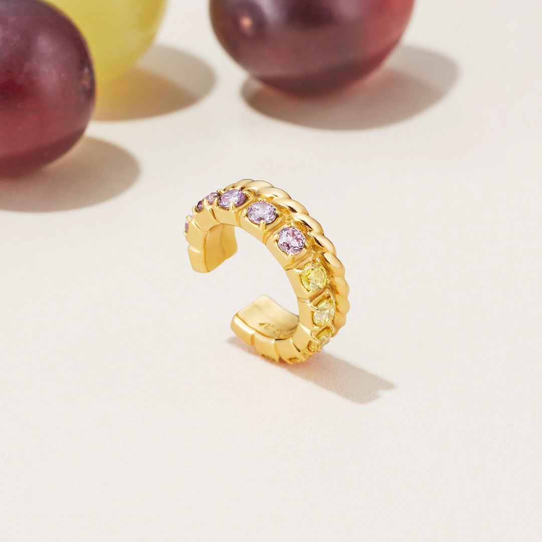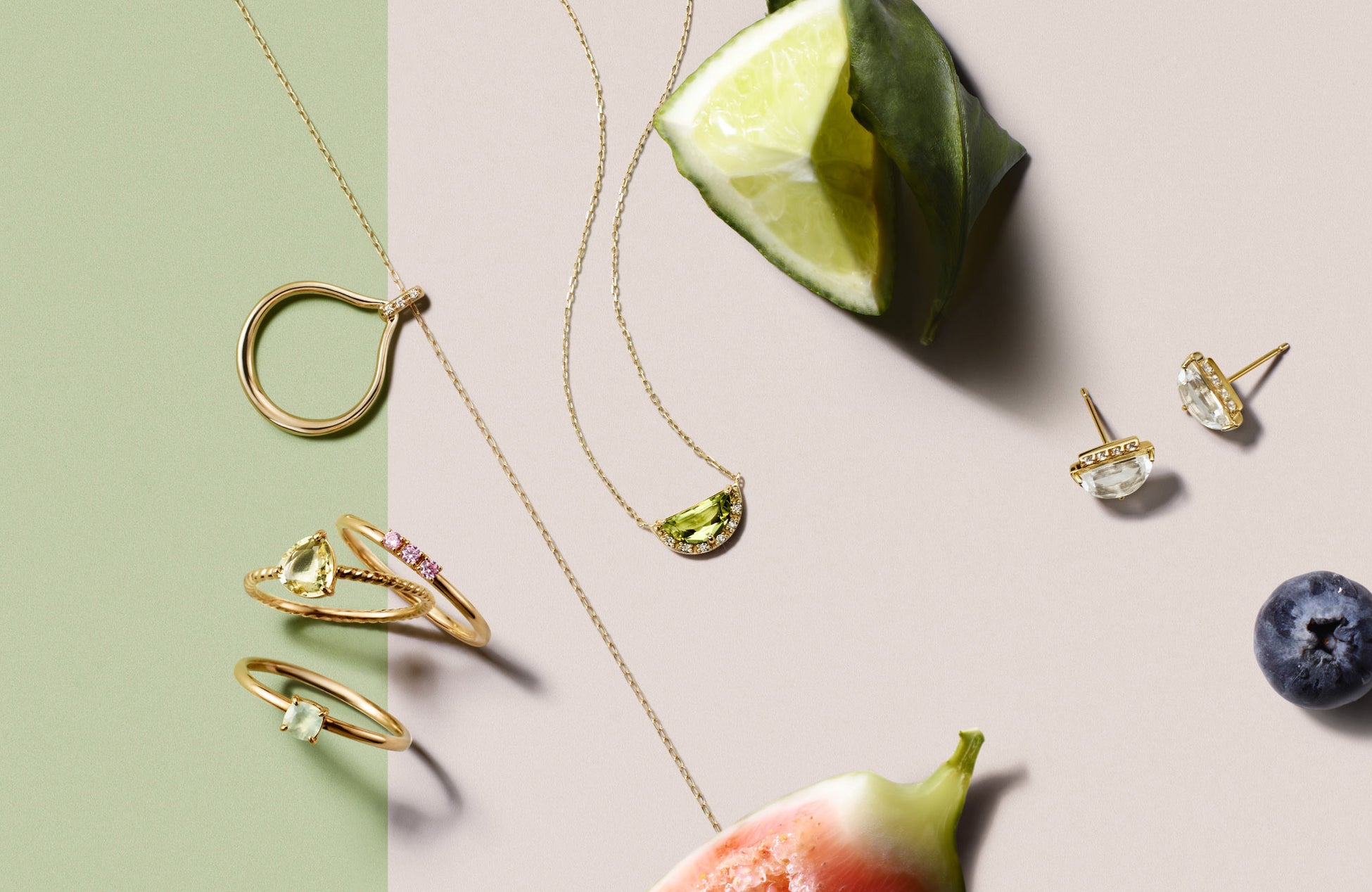 実りあふれる果実のフォルムを表現した鮮やかなカラーストーンや、アイテムごとに異なる地金のカラーとのコントラストが煌めくコレクションです。爽やかな美しいライムと、ころんとしたいちじくのシルエットを連想させるデザインは、普段のコーディネートのアクセントに。ベリーやマスカット、グレープを連想させるカラーリングを纏ったジュエリーは春の日差しに映え、日々を彩ります。