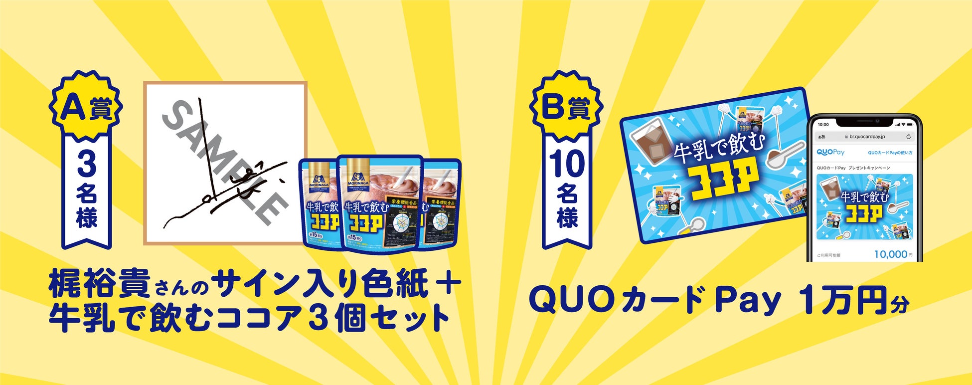 森永製菓公式 X(旧 Twitter)アカウントをフォローし、対象の投稿をリポストした方の中から抽選で10名様に、QUOカードPay 10,000円分が当たります。さらに、指定のハッシュタグ「#牛ココサンバ」をつけて、引用ポストで動画を見てわかるクイズに解答してくださった方の中から抽選で3名様に、梶裕貴さんのサイン入り色紙と牛乳で飲むココア3個のセットが当たります。