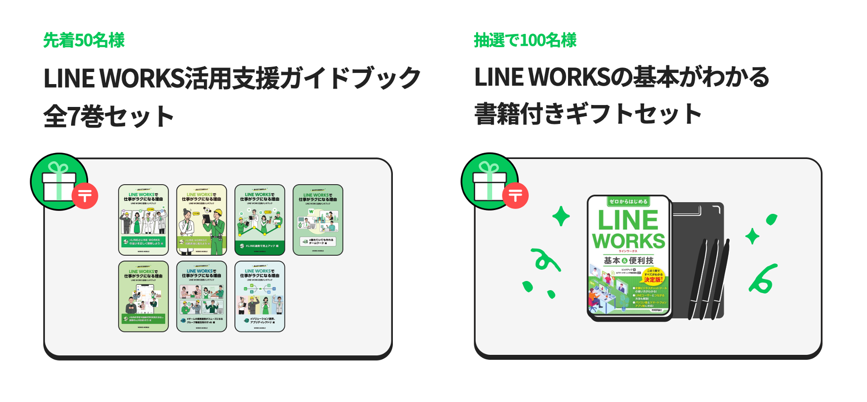 キャンペーン内容 : 先着50名にLINE WORKS活用支援ガイド全7巻セット、または抽選で100名に、IoTマーケティング監修の書籍『ゼロからはじめる LINE WORKS 基本&便利技』(技術評論社)を含むオリジナルギフトセットをプレゼントいたします。