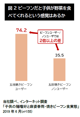 そうした悩みを解決するのが、春雨・ビーフンなどの「麺入り惣菜」。お子様が好きな「麺」を取り入れ、麺と野菜が絡むことで、自然と野菜がモリモリ食べられるのが特長です。実際、当社「五目焼きビーフン」のユーザーとノンユーザーを比較したところ、「ビーフンだと子供が野菜を食べてくれる感覚がある」と答えた割合がビーフンユーザーではノンユーザーの2倍以上、という結果が出ています(図2)。