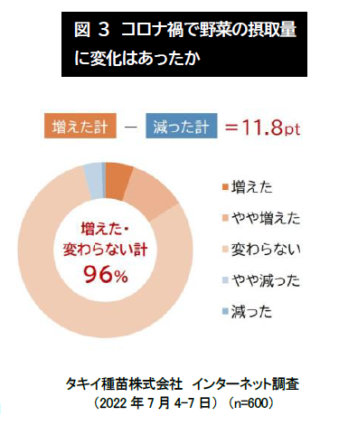生活者の野菜摂取のニーズは根強く、コロナ以降の野菜の値上がりの中でも、野菜の摂取量が「増えた」「変わらない」人が大部分を占めています(図3)。「五目焼きビーフン」をはじめとする当社ビーフン惣菜も、2022年度の売上が2020年度比200%と大幅に伸長しており、「野菜がモリモリ食べられる」価値が広く受け入れられていることがうかがえます。