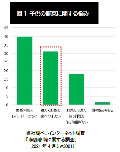 健康への意識が高まっている今、多くの方が「子供(家族)に野菜を摂ってもらいたい」と考えています。また、どうしたら子供が野菜を食べてくれるかは、いつの時代も調理をする人の大きな悩みのひとつです(図1)。