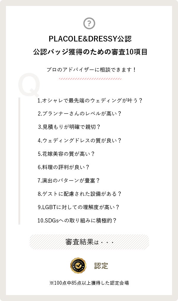 公認バッジの審査基準は以下の10項目を基準とし、85点以上を獲得した結婚式場のみ贈呈されます。