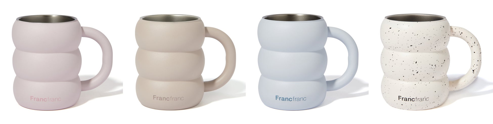 もこもこしたかわいいフォルムとトレンド感のある淡いカラー、スプラッターカラーが魅力のステンレスマグとステンレスボトルです。取手の太さやもこもこの幅にもこだわったFrancfrancオリジナルの型がポイントです。飲みごろ温度をキープしながらあたたかいドリンクをたっぷり楽しめます。