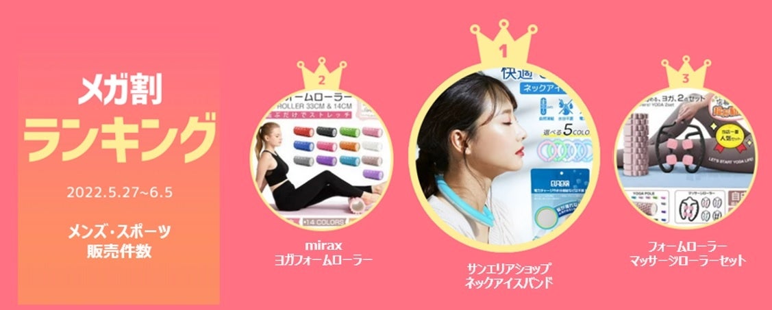メンズ・スポーツカテゴリーでは、前回同様に、自宅でも楽しめるセルフケア商品がランキングのトップ10のうち7位までを占める結果となりました。そんな中でも今回は、熱中症対策として首にかけて使用する「ネックアイスバンド」が1位に輝き、夏前に開催されたメガ割らしいランキング結果となったと言えます。他にも、9位に「冷感メンズパンツ」がランクインし、暑い夏に備え、準備している様子が反映された結果とも言えそうです。