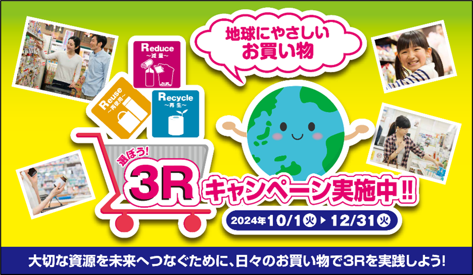 環境省では、令和6年8月に閣議決定された「第五次循環型社会形成推進基本計画」に基づき、ライフサイクル全体の最適化を図るために、消費者に近い事業者として特に主導的な取り組みが期待される小売事業者及びメーカーと連携した『選ぼう!3Rキャンペーン』を実施しています。