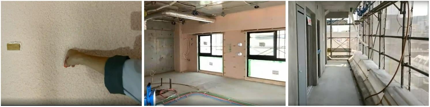 (写真左:断熱材の厚さを測るピンを刺す様子、中央:壁のないスケルトン状態の一室、右:工事中の廊下)