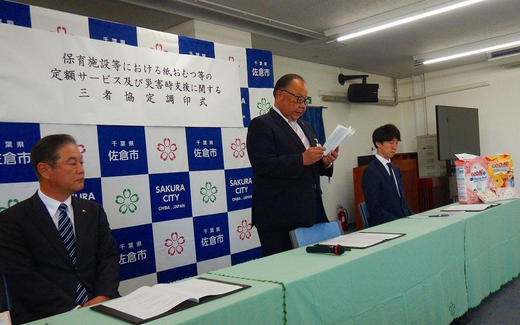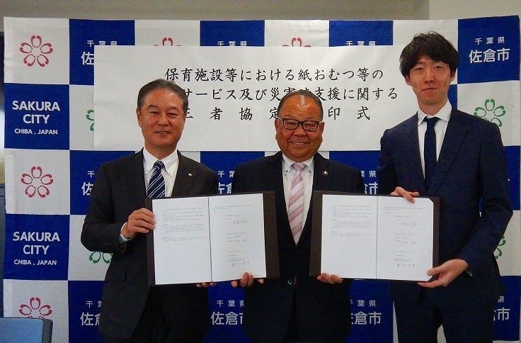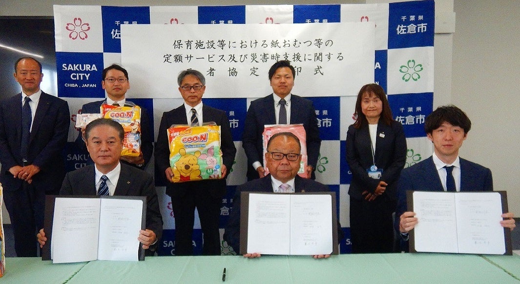 千葉県佐倉市(市長:西田三十五)は、保育園向け紙おむつの定額サービス「おむつん」を企画・運営する有限会社いとう教材社(代表取締役:伊藤 淨堯)及び大王製紙株式会社(代表取締役社長 社長執行役員:若林 賴房)とともに市内保育施設を活用し防災強化を目指す取組として、自治体と紙おむつの定額サービス事業者に加え、紙おむつのメーカーが参画する全国初の取組となる「保育施設等における紙おむつ等の定額サービスおよび災害時支援に関する三者協定」を2025年5月7日(水)に締結しました。