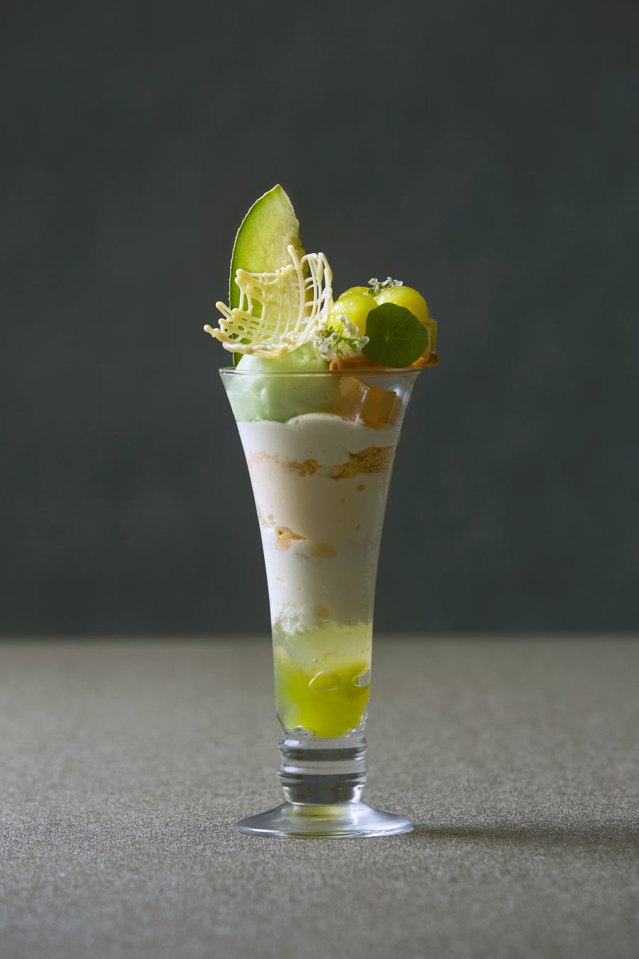 見目麗しいメロンを存分に楽しめる贅沢なパフェが登場。爽やかなハーブのジュレと濃厚なヨーグルトクリームが、メロンの甘さを最大限に引き出します。清涼感溢れるレモンヨーグルトソースをかけて、お召し上がりください。