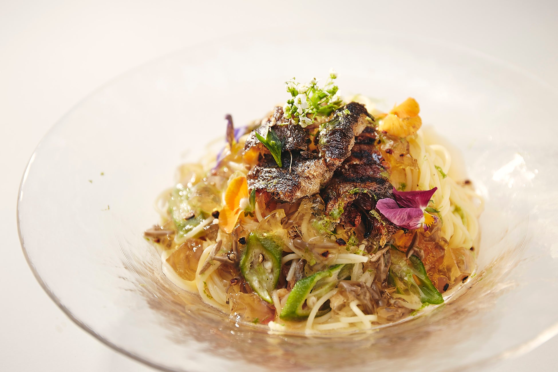 和歌山県の新鮮な熊野鮎を丁寧にコンフィにし、清涼感あふれる生じゅんさいとともに冷製カペリーニに仕立てました。夏の暑い日にぴったりの、爽やかで贅沢な一皿です。