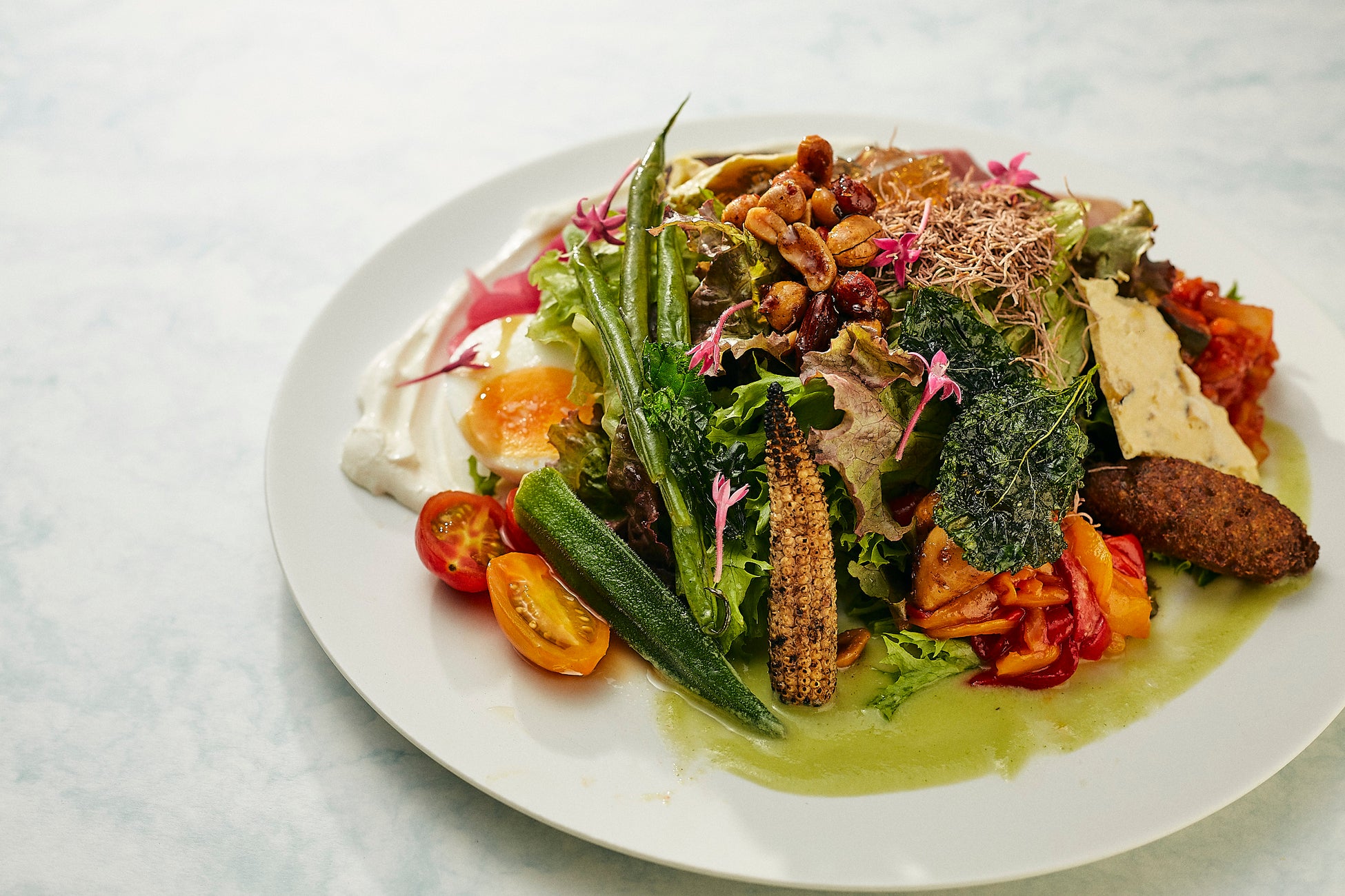 旬の野菜を使った夏を感じるシェフ自慢の一皿です。ヴィーガンサラダへの変更も可能です。