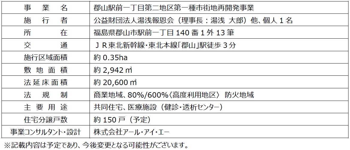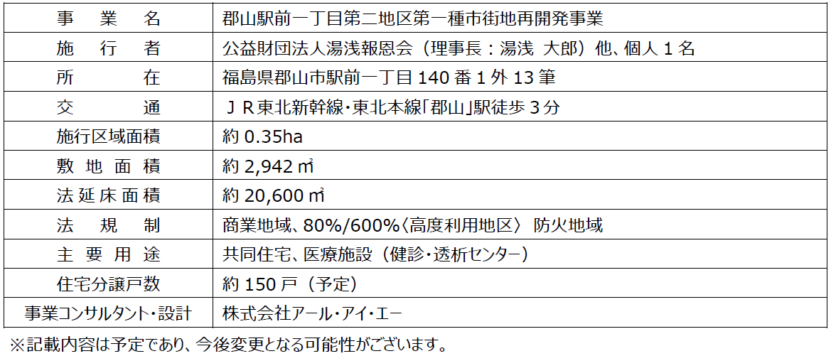 本事業は、第一地区に移転した寿泉堂綜合病院跡地に、共同住宅と医療施設(健診・透析センター)からなる複合再開発を計画しており、地方医療の下支え、中核都市における都市型コンパクトタウンの実現を目指します。また、「郡山」駅徒歩3分に位置し、地区周辺を含めて、今後も更なる発展の見込めるエリアとなっております。