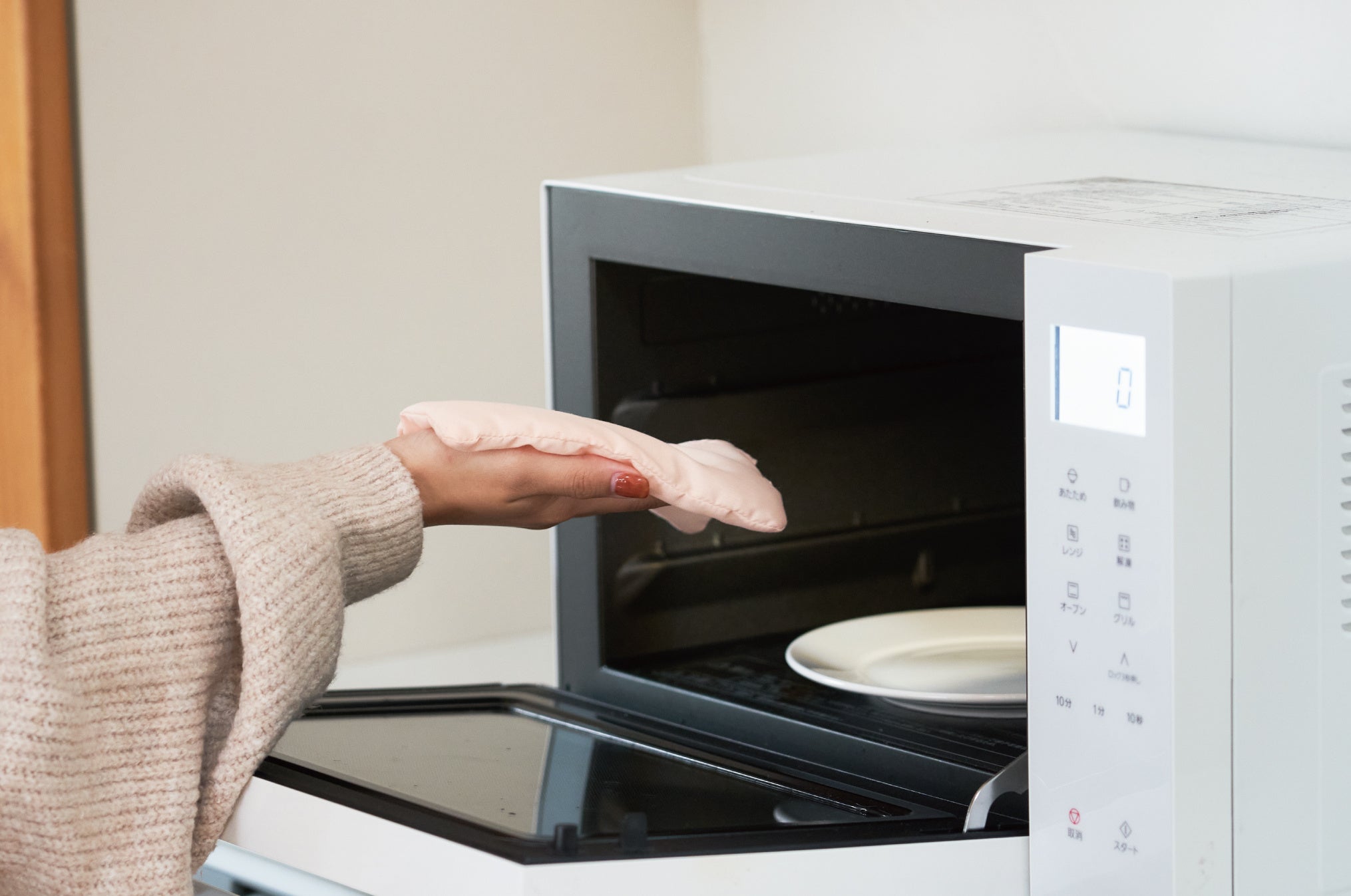 ビーズ袋を電子レンジ(500Wで30秒)で温め、ふんばるずウォーマーの背中に入れてください。