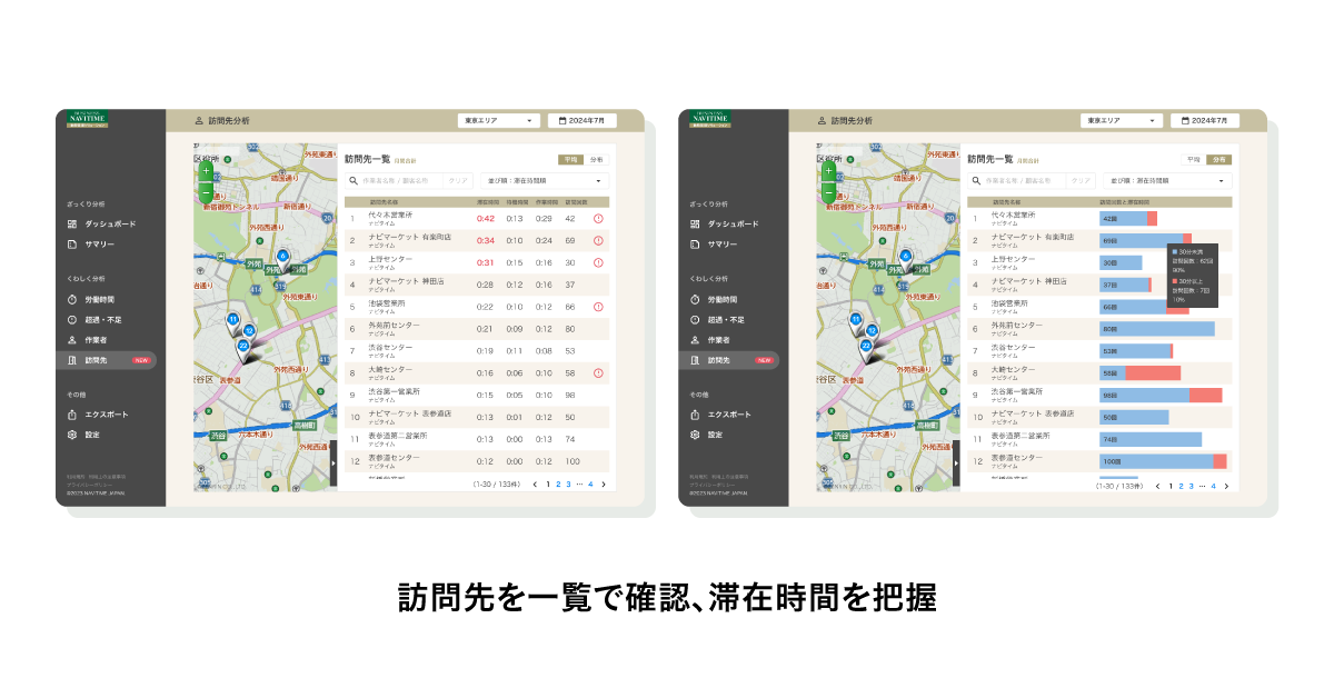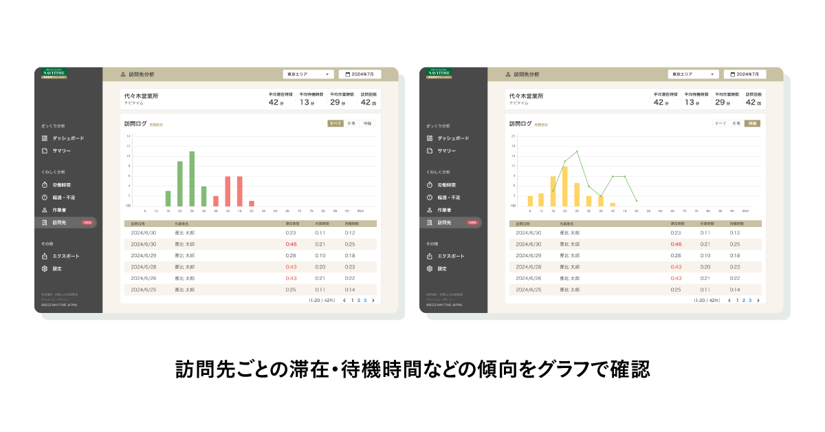 訪問先単位、待機時間、作業時間を比較して分析することができ、滞在時間が長い傾向にある訪問先や突発的な長時間滞在の検知も行えます。