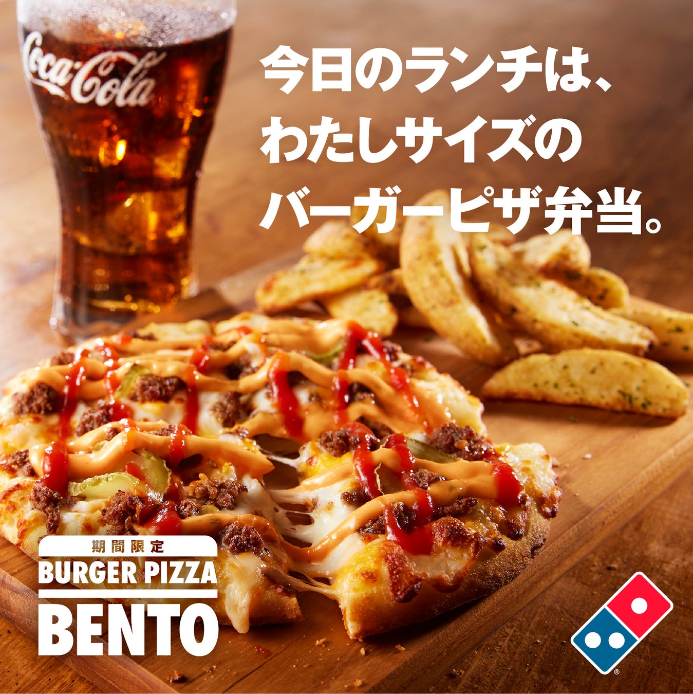 また、2024年7月22日(月)より「マイドミノ」から、“ちょうどいい”コンパクトサイズのお弁当へリニューアルを果たした「ピザBENTO」でも、「チーズバーガーピザ」シリーズをお楽しみいただけます。「ピザBENTO」は、「チーズバーガーピザ」、「てりやきバーガーピザ」が対象で、ビーフパティとクリスピーチキンの2種、各4種類をお選びいただけます。さらに、+150円で、お好きなドリンクがつけられます。