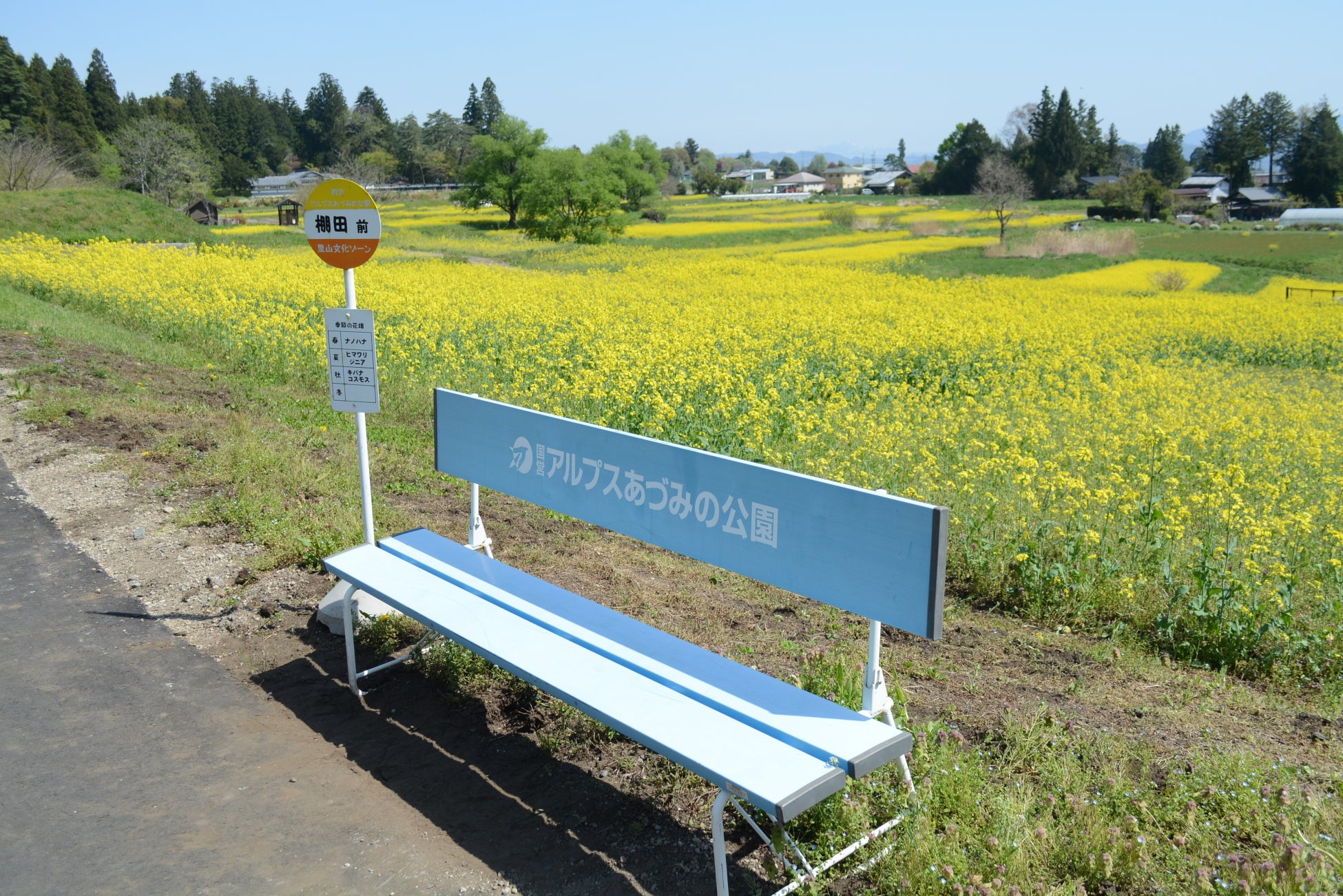 里山文化ゾーンのナノハナ畑も見ごろとなっています。視界いっぱいに広がる6ha、500万本の広大なナノハナ畑は5月上旬ごろまでお楽しみいただけます。ナノハナとの撮影を楽しめるベンチやバス停などのフォトスポットも設置しております。
