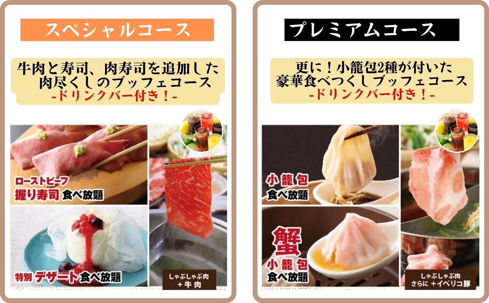上位のコースでは、肉の旨みがギュッとつまった『肉寿司』や『牛しゃぶ』、蒸したて熱々の肉汁たっぷりの『小籠包2種』なども食べ放題!