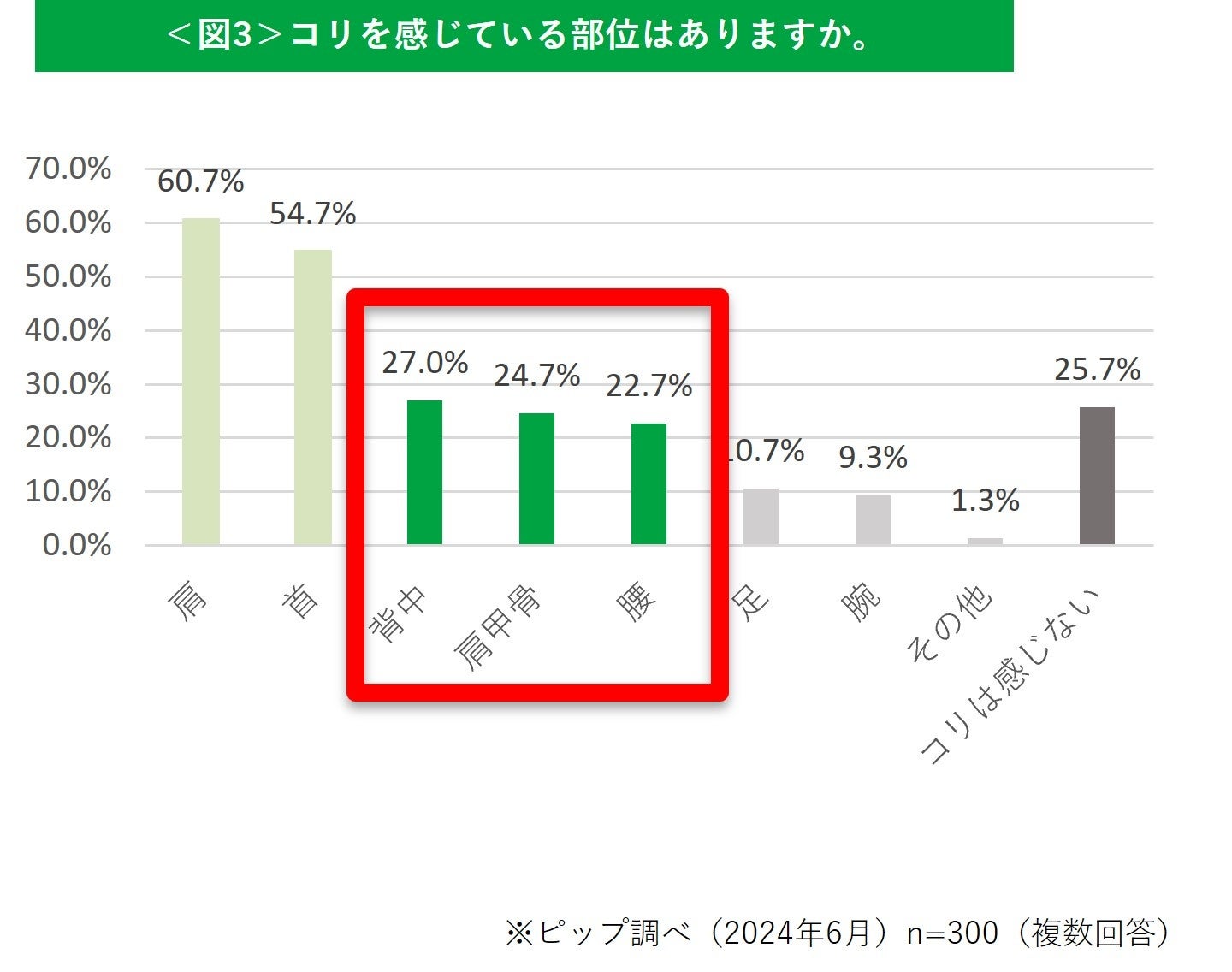 「コリを感じている部位はありますか。」と質問したところ、コリ有訴者にとって常連部位である「肩(60.7%)」「首(54.7%)」に続いて「背中(27.0%)」「肩甲骨(24.7%)」「腰(22.7%)」と背面のコリが目立つ結果となりました<図3>。