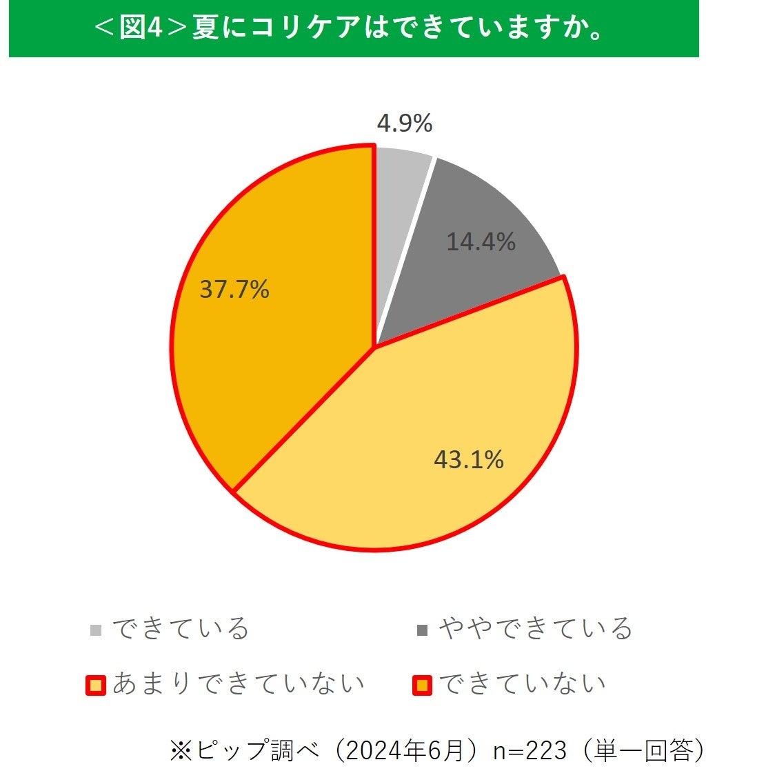 また、「コリは感じない(25.7%)」以外を選択されたコリ有訴者223名を対象に、「夏にコリケアはできていますか。」と聞いたところ、「あまりできていない(43.1%)」と回答した人が最も多く、次いで「できていない(31.1%)」 と80.8%の方が夏にコリケアができていないことが判明しました<図4>。