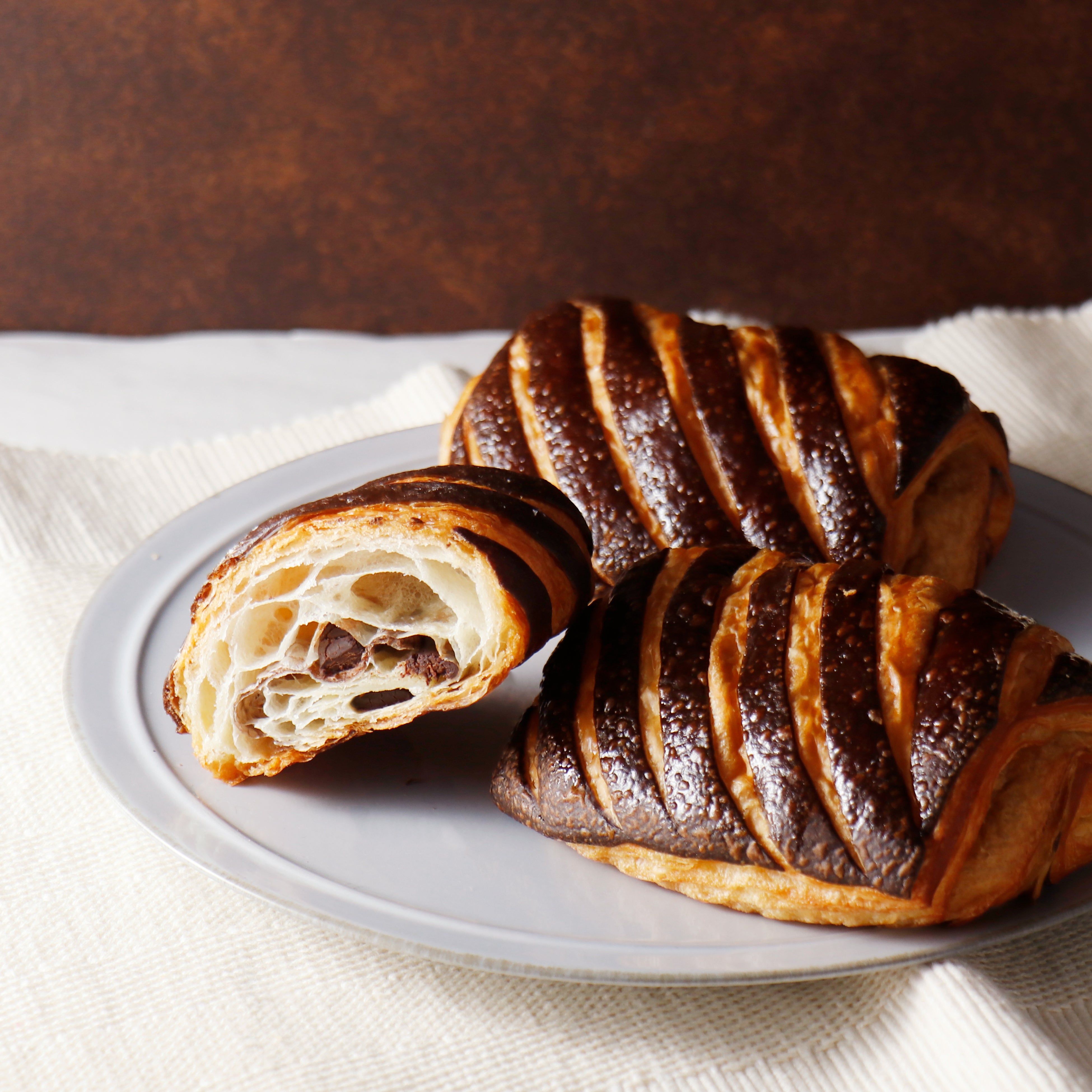 2種のクロワッサン生地で縞模様が特徴的な「パン オ ショコラ」