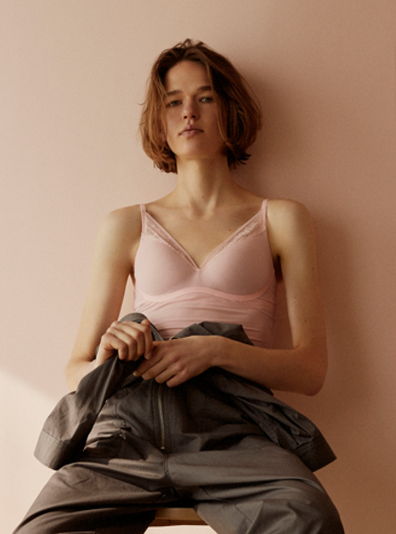 [P]と[BV]には、新開発のヒートシールワイヤーを採用。立体的で幅のあるシールがアンダーバストを程よくサポートし、ボディにフィットます。ノンワイヤー[Top]は軽い着けごこちのブラレットタイプ。通気性のよいスペーサーカップを採用しています。ショーツ2型はレーシーなバックスタイルにもご注目ください。コスメティックなニュアンスの3色展開です。