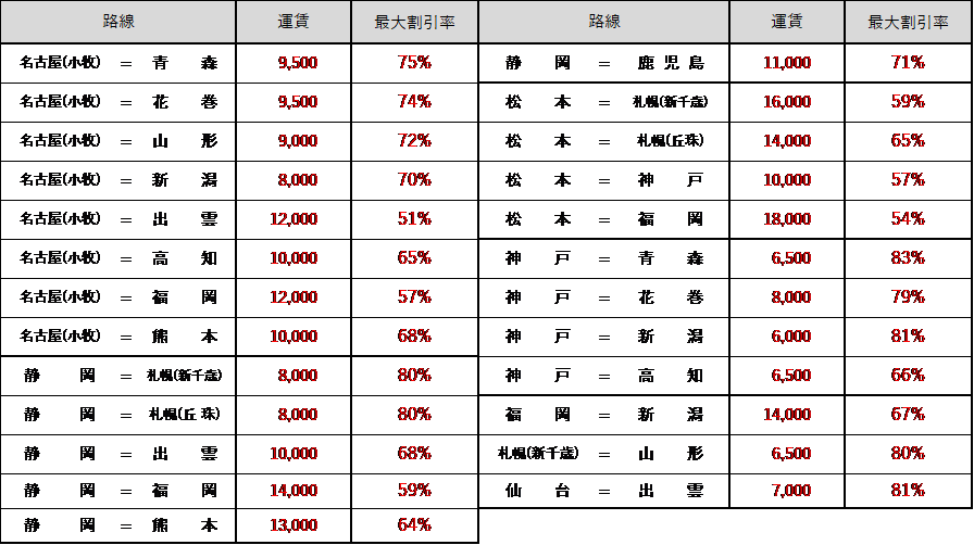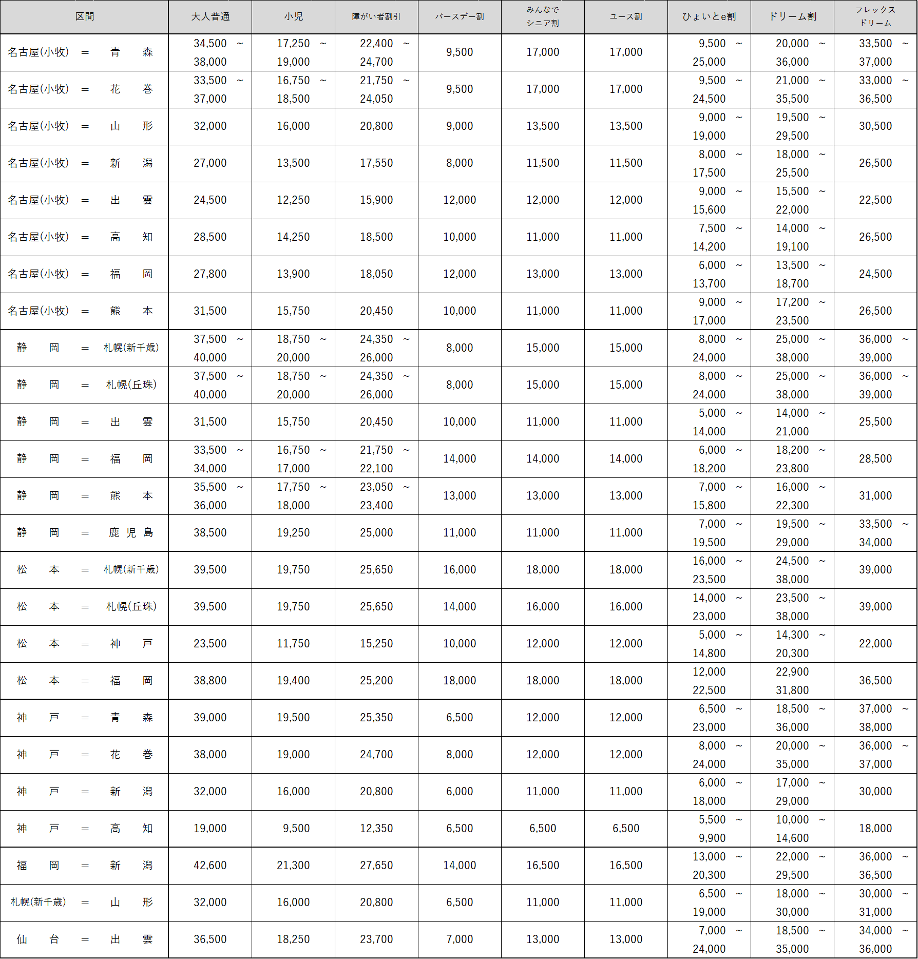 ※『静岡=札幌(新千歳)』線の運賃は、上記の『静岡=札幌(丘珠)』線と同じ運賃となります。