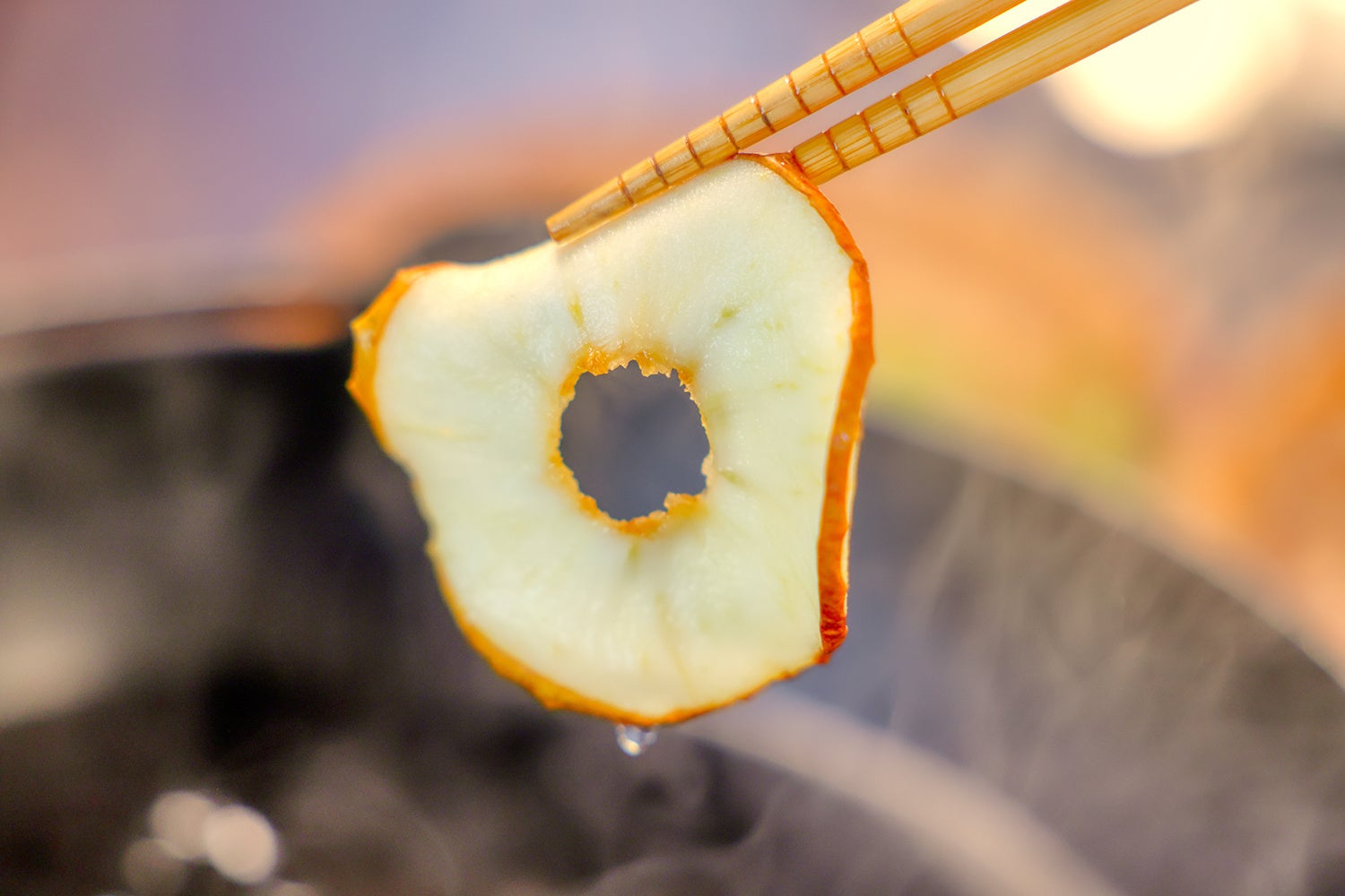 りんごスライスを乾燥させたリンゴチップを豚や牛の肉と一緒にしゃぶしゃぶで楽しむ。