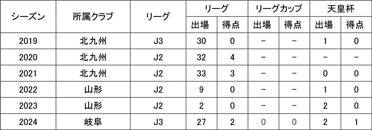 所属歴/小禄中 – 流通経済大学付属柏高 – 流通経済大 – ギラヴァンツ北九州 – モンテディオ山形 – FC岐阜