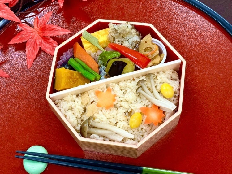 五目ご飯にしめじ・銀杏を散らし、舞茸天ぷらや薩摩芋蜜煮など秋の味覚を取り入れたお弁当です。