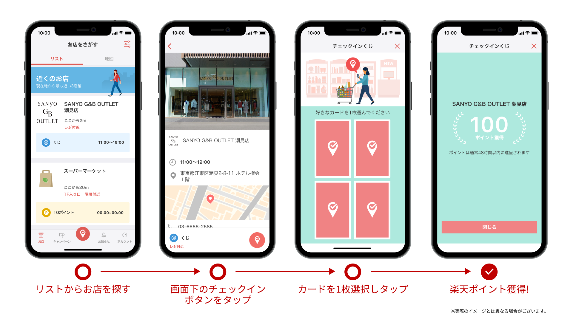 これにより、利用者は店内の指定エリアで「楽天チェック」アプリを起動しチェックインすると、くじ形式で「楽天ポイント」を最大100ポイント獲得することができるようになります。