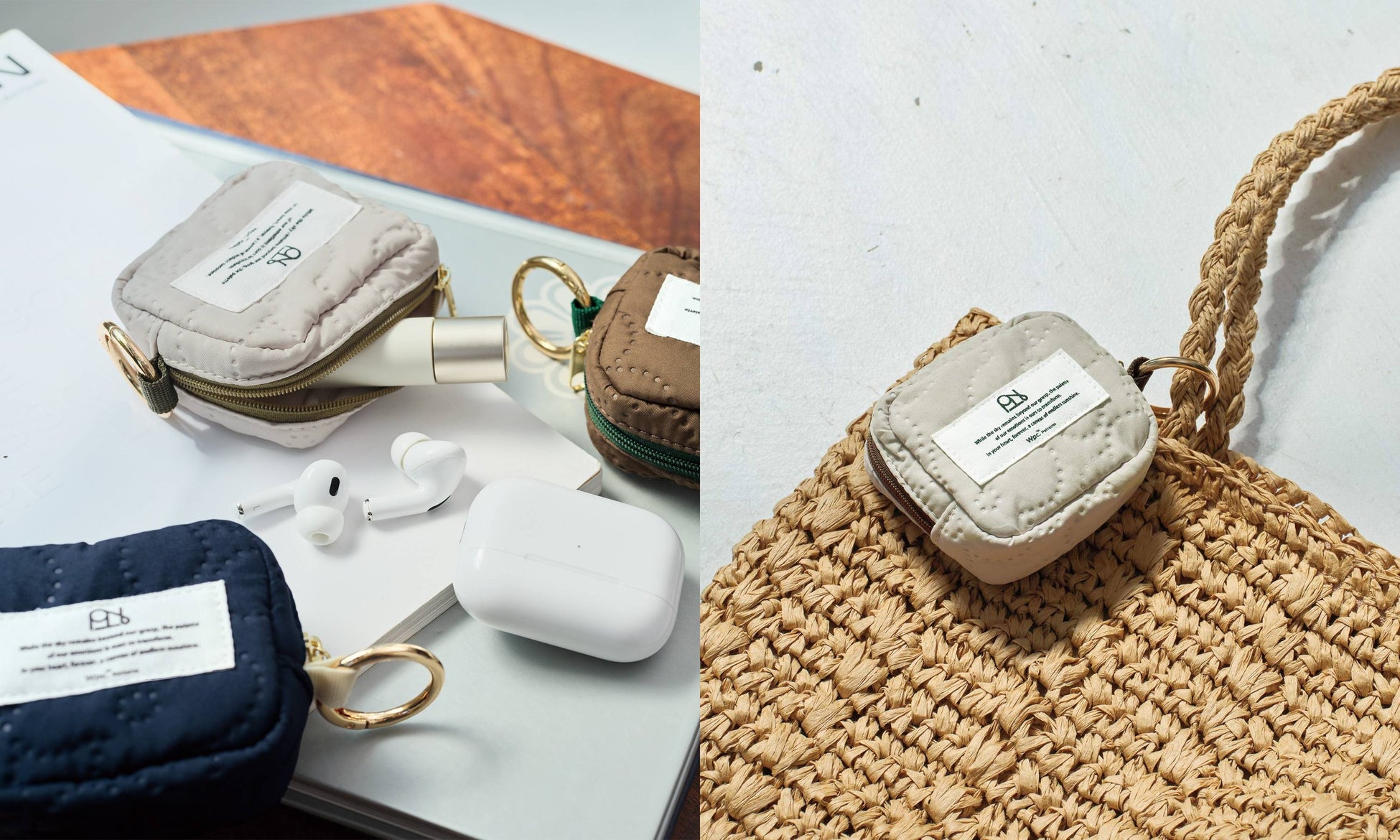 イヤホンや充電ケーブル、アクセサリーなどの細かなアイテムをまとめて収納でき、リング付きのカラビナでバッグに取り付ければ、必要なときにさっと取り出せます。