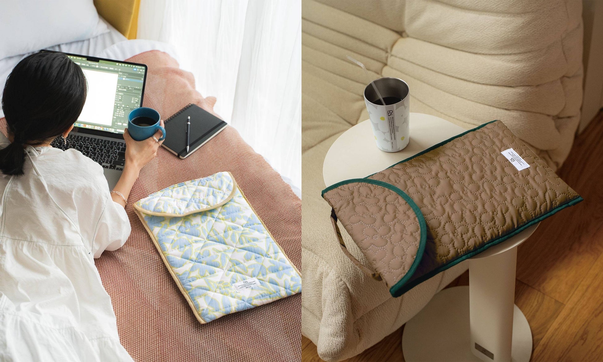 水を弾きやすい傘生地のキルティング素材を使用しており、出張や旅行などの持ち運びにも気兼ねなく使えるアイテムです。