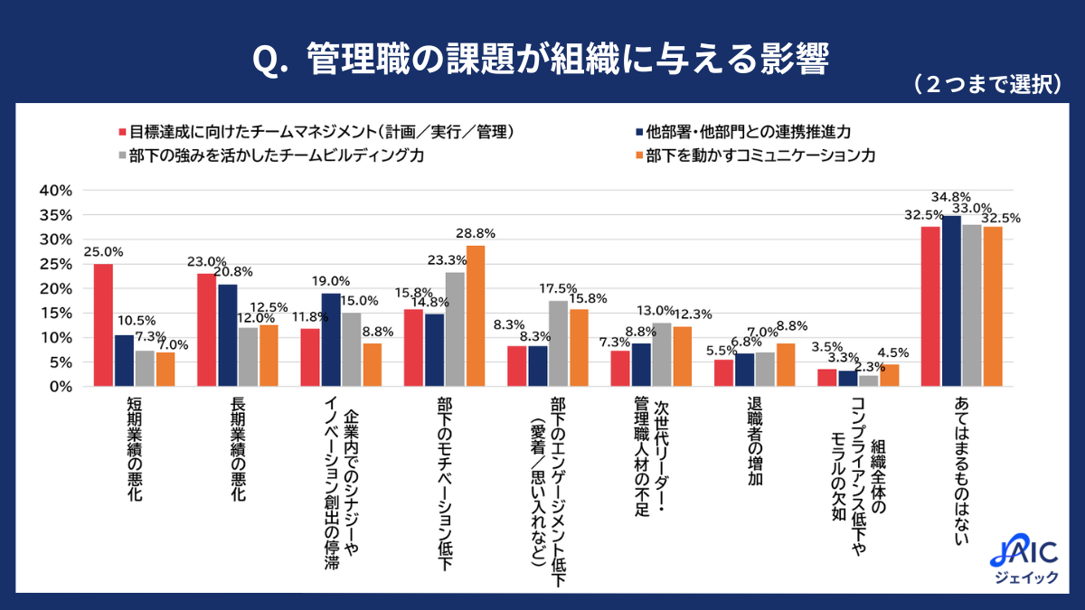 「短期業績の悪化」(25.0%)や「長期業績の悪化」(23.0%)の割合が高く、管理職の計画や実行力が企業業績に直結する可能性が改めて示されました。