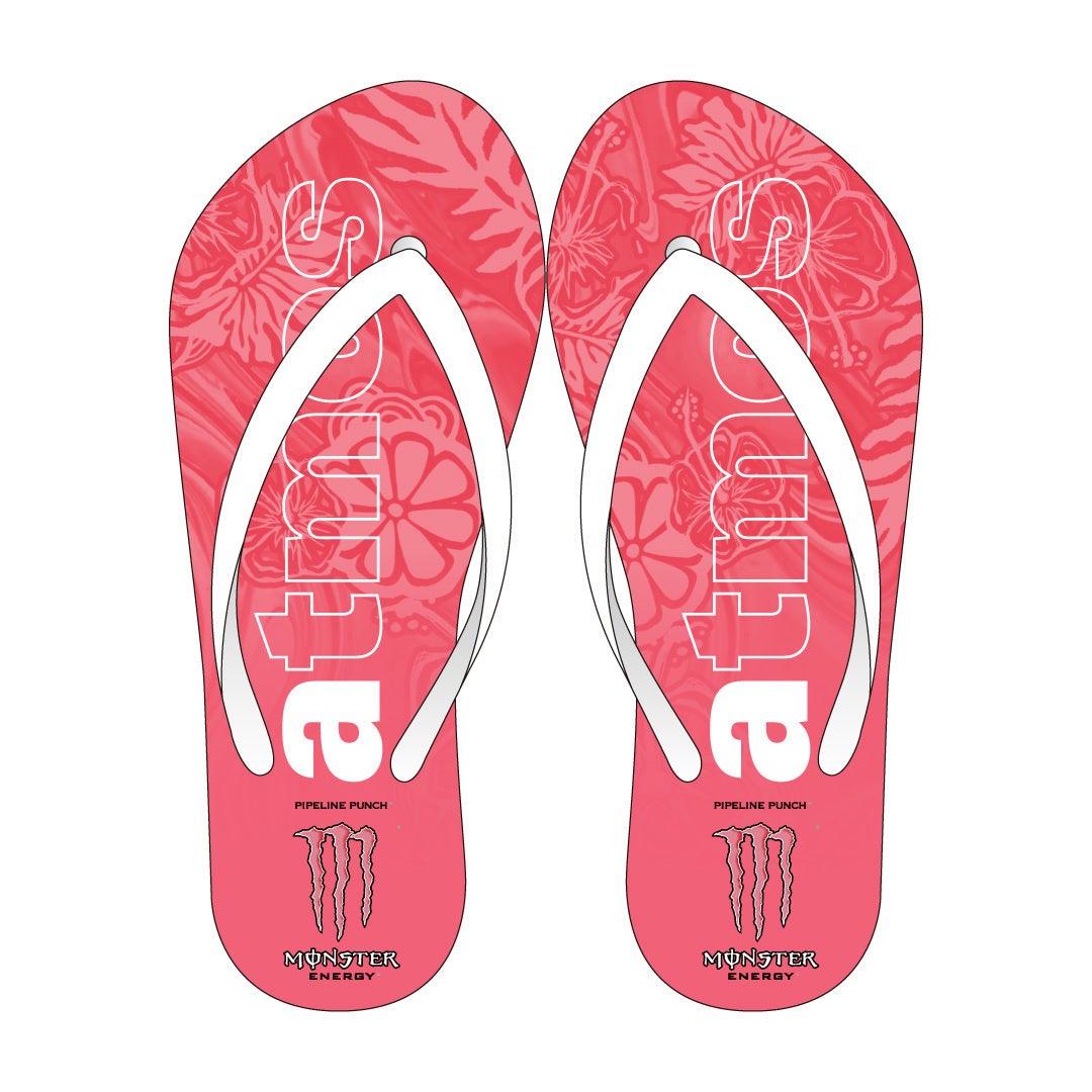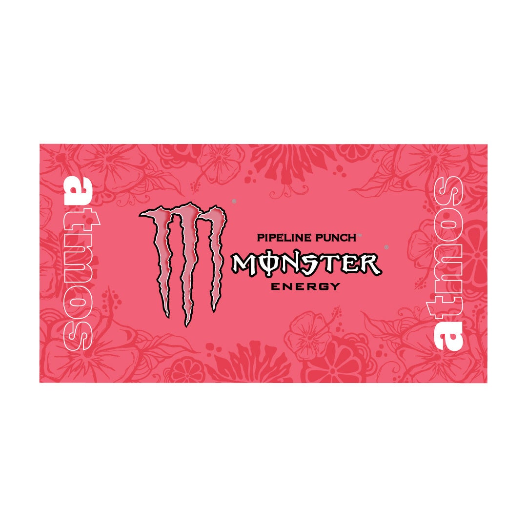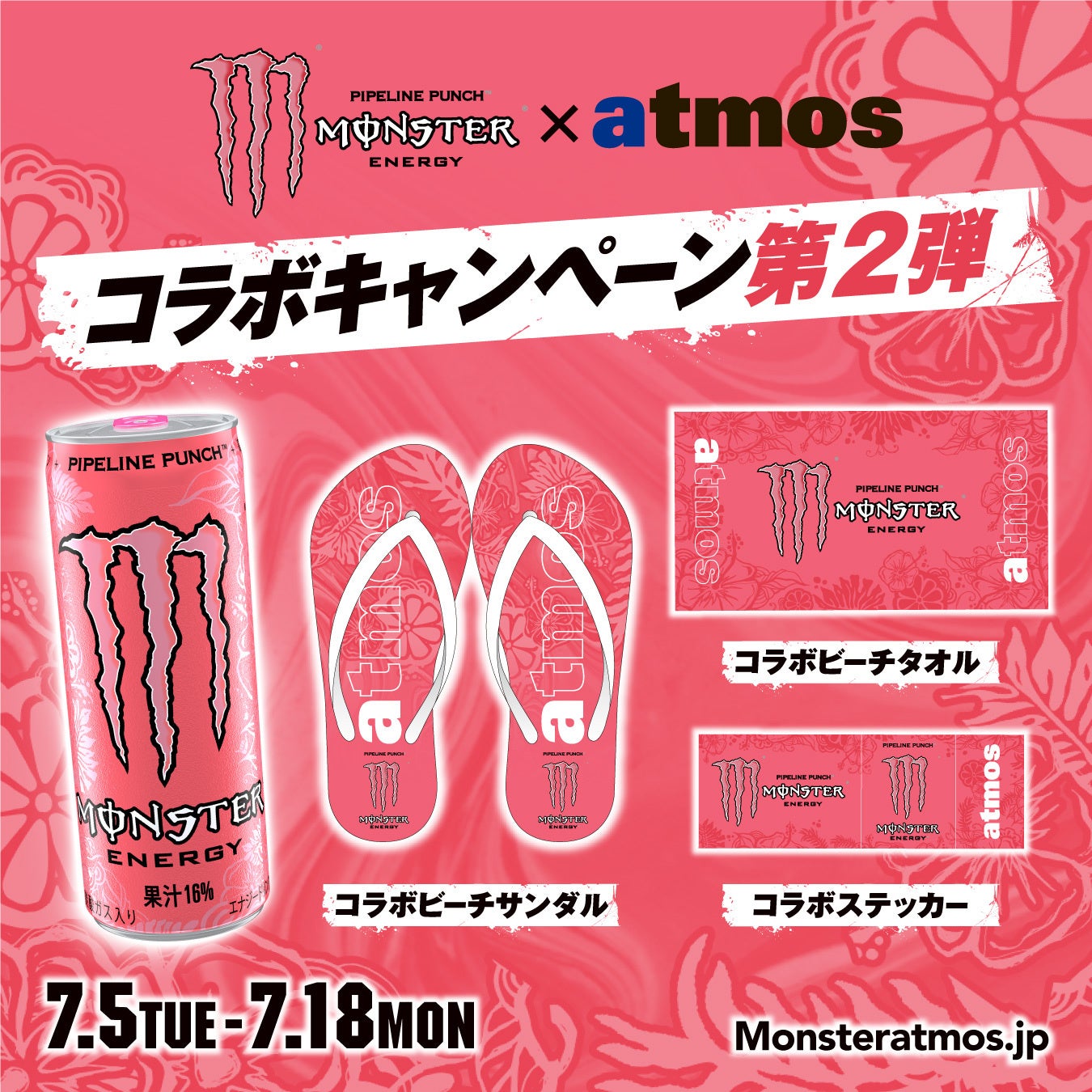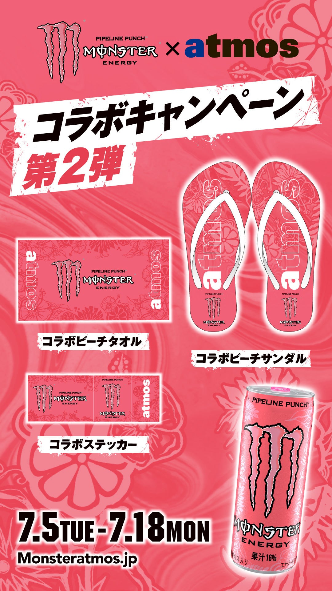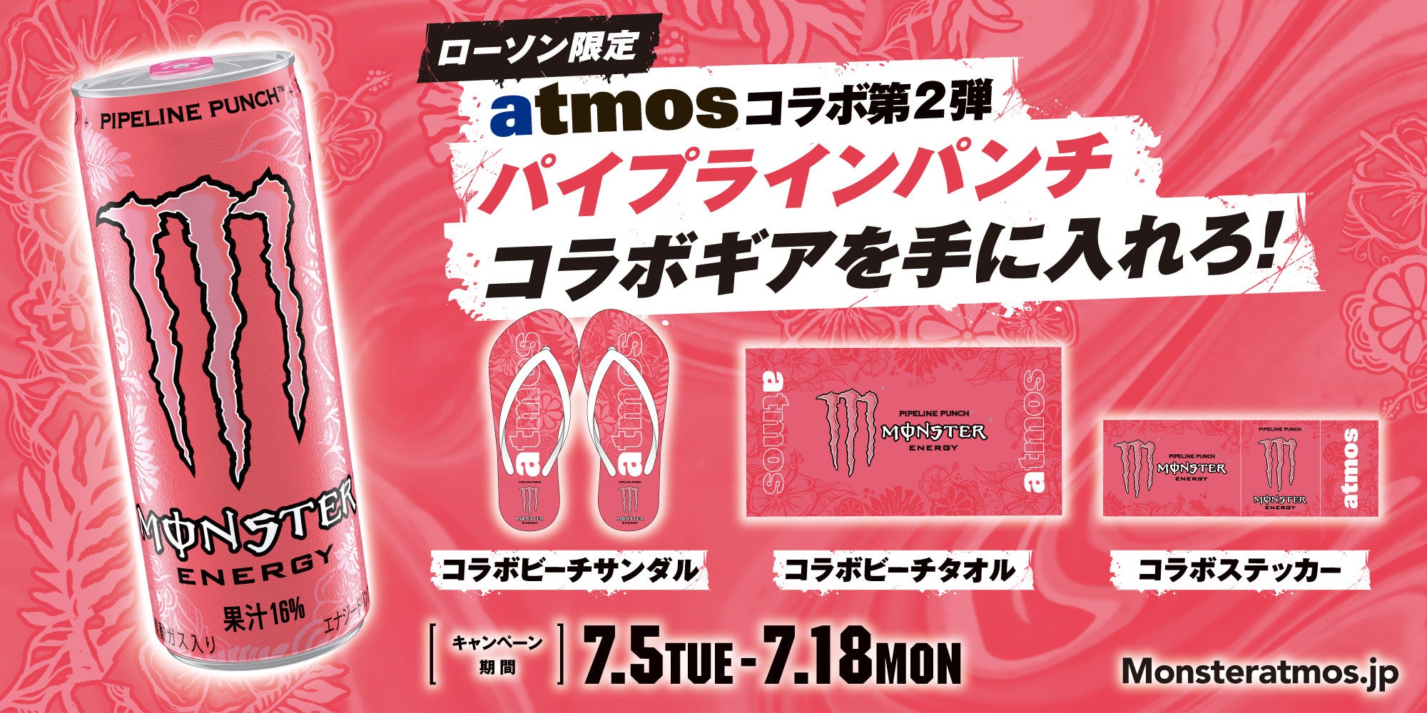 7月5日(火)~ 7月18日(月)の期間中、全国のローソンで対象商品を3本購入したレシートを撮影して専用のキャンペーンサイトから応募すると、抽選で300名様にビーチサンダルが、200名様にはビーチタオルが当たります。更に店頭では、2本購入で各店舗先着20名様にパイプラインパンチとatmosのロゴを使用したコラボステッカーが手に入る、モンスターファン、atmosファン必見のキャンペーンとなっています。