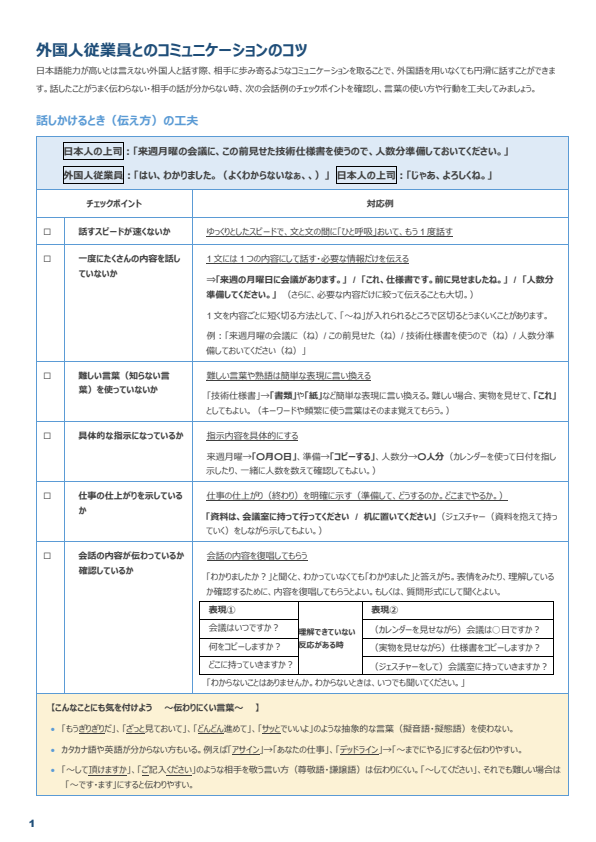 参加頂いた方には、すぐに使える「外国人従業員とのコミュニケーションのコツ」シートを配布します。
