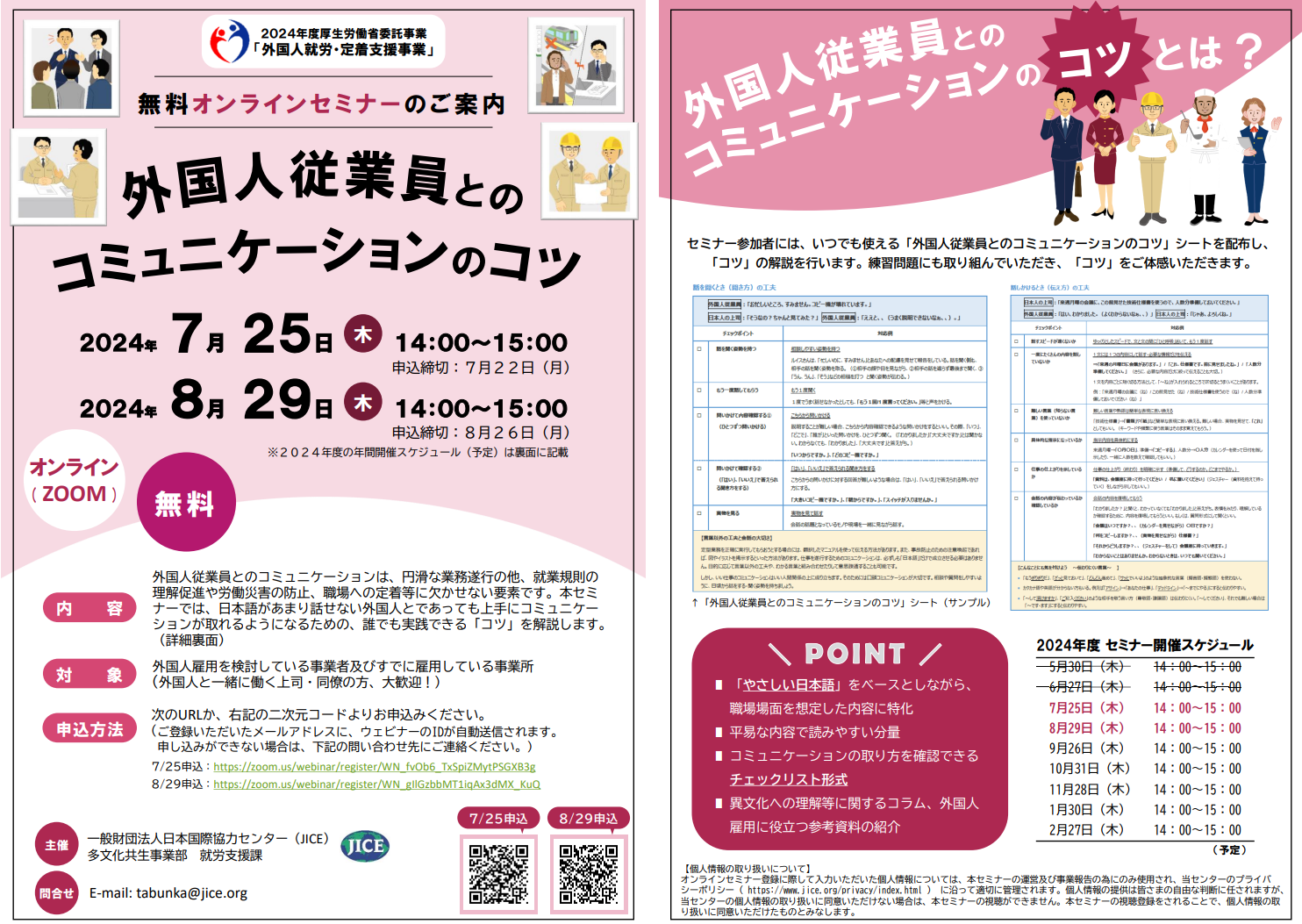 外国人従業員とのコミュニケーションにお困りではありませんか?外国人従業員を雇用する、あるいは雇用を検討する事業者の皆様へ向けたオンラインセミナーを開催します。(参加費無料、短時間から参加可能です。)