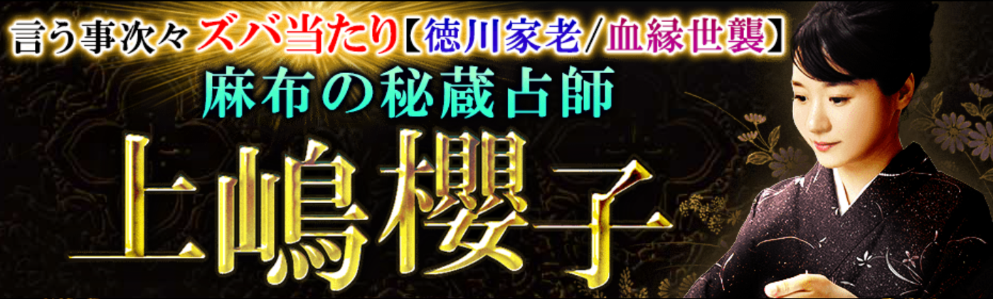 先祖は徳川家城代家老を務めた一族であり、代々血縁世襲で伝わる秘蔵占でその人の運命・宿縁を読み解いてきた「上嶋櫻子」。名前と生年月日に、今の時間を掛け合わせ、他の占いとは一線を画す「当て技」であなたに訪れる運命と現実を詳細に鑑定していきます。