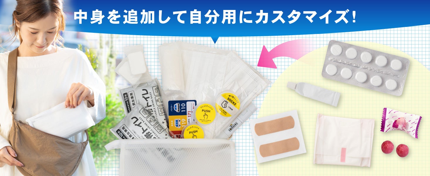 一般的な防災セットは使い捨てのものが多いですが、本製品は必要に応じてアイテムを追加・交換できる仕様。自分好みにカスタマイズすることで、より実用的な防災ポーチとして活用できます。