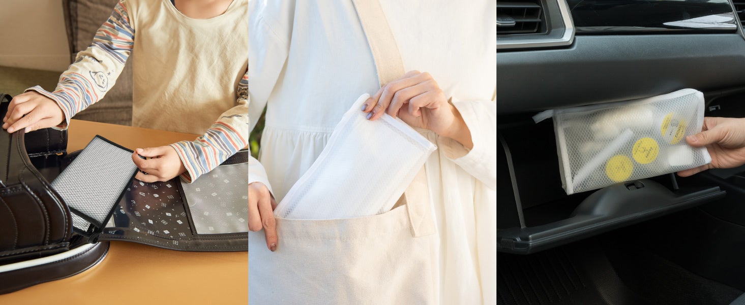 A5サイズ程度のコンパクトなポーチにすべてのアイテムが収納されており、カバンに入れても邪魔になりません。ブラックは男性用、ホワイトは女性用の下着が入っているため、パッケージにはわかりやすい注意書きを記載しています。