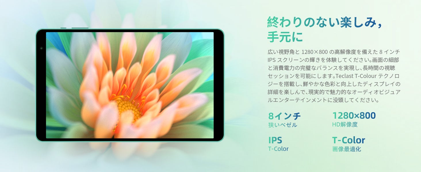 Teclast「P85T」の広い視野角と1280×800の高解像度を備えた8インチIPSスクリーンの輝きを体験してください。画面の細部と消費電力の完璧なバランスを実現し、長時間の視聴セッションを可能にします。T-Colourテクノロジーを搭載し、鮮やかな色彩と向上したディスプレイの詳細を楽しんで、現実的で魅力的なオーディオビジュアルエンターテインメントに没頭できます。