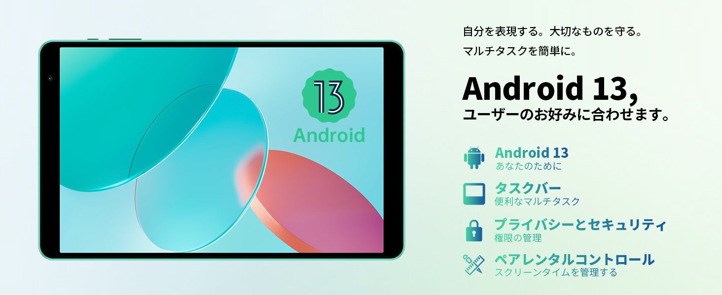 8インチ / Android 13 / 8GB+64GB+1TB TF拡張 / WiFiモデル / Widevine L1対応 / 3.5mmヘッドホンジャック