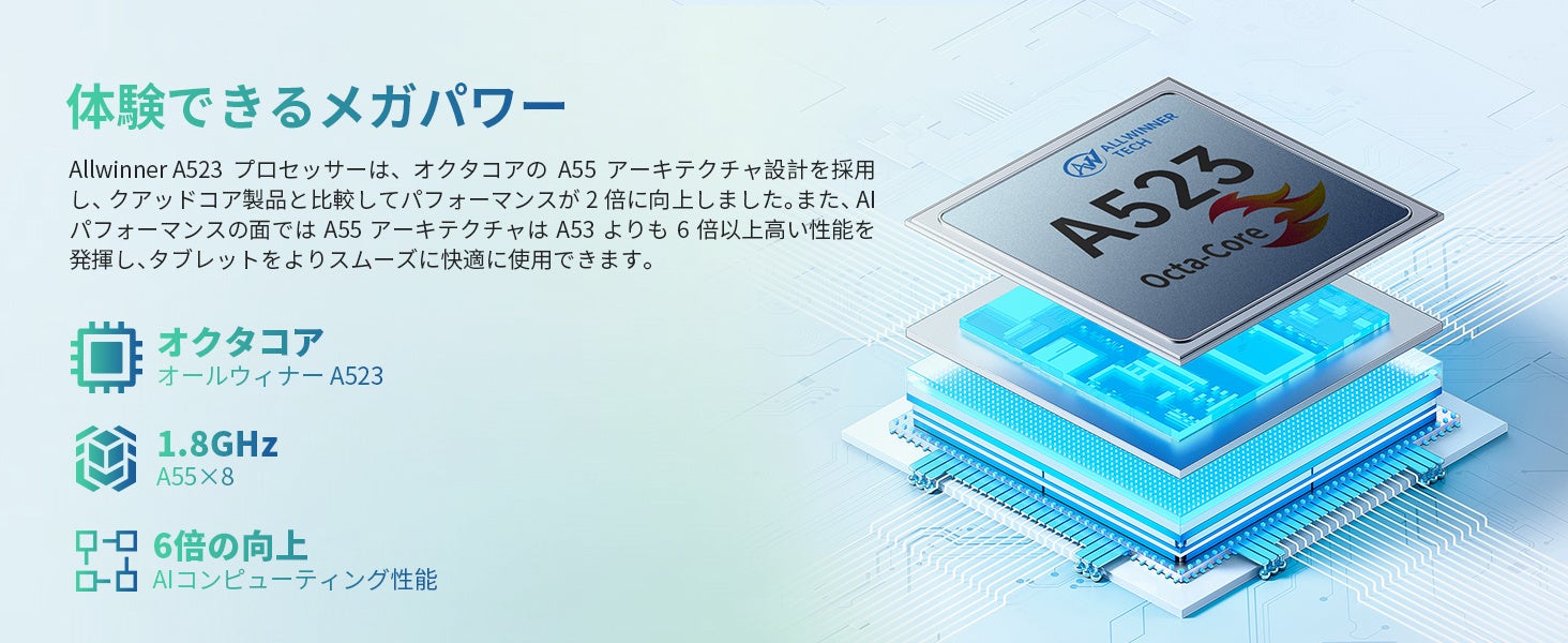 Allwinner A523プロセッサーは、オクタコアのA55アーキテクチャ設計を採用し、クアッドコア製品と比較してパフォーマンスが2倍に向上しました。また、AIパフォーマンスの面ではA55アーキテクチャはA53よりも6倍以上高い性能を発揮し、タブレットをよりスムーズに快適に使用できます。