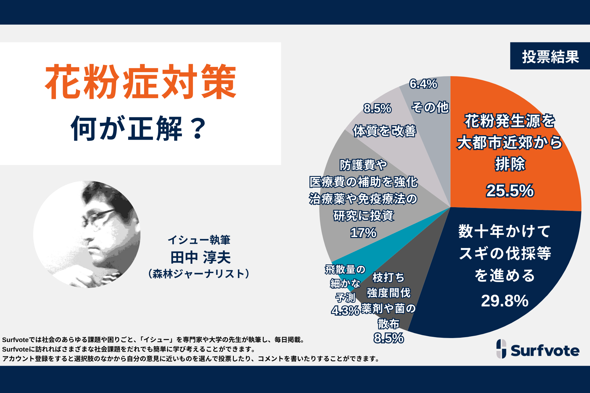 日本唯一の森林ジャーナリストの田中淳夫氏が花粉症に関する政策や対策方法について紹介。どのような対策が有効か?Surfvoteに意見を投票した人からさまざまなコメントが集まりました。