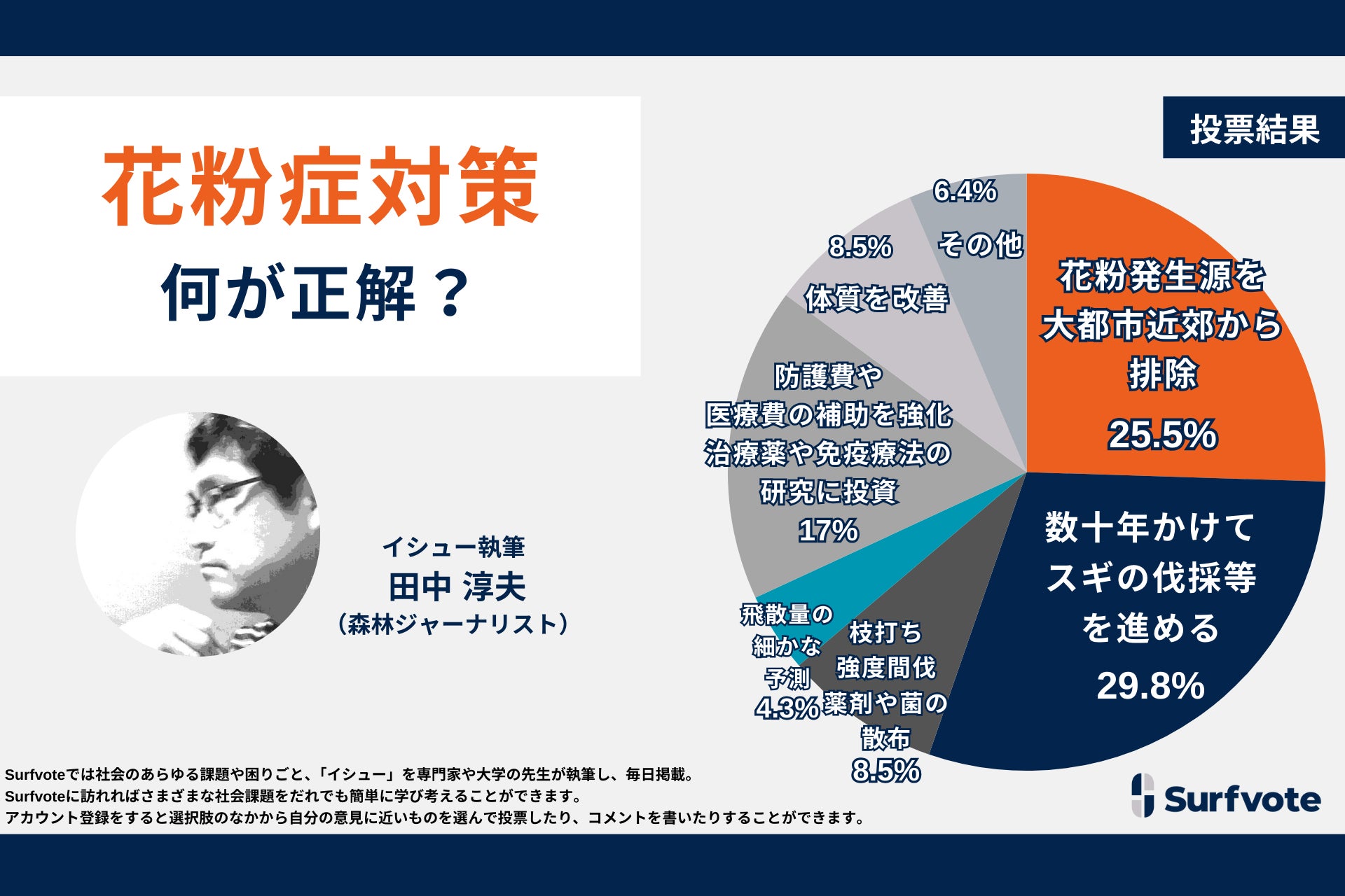 日本人の4割が苦しむスギ花粉症。この国民病を克服するにはどうすべきか?「花粉症対策」についてSurfvoteの意見投票では5割以上が「スギ伐採が必要」と回答。しかし、自然破壊やコストなど問題は大きい。
