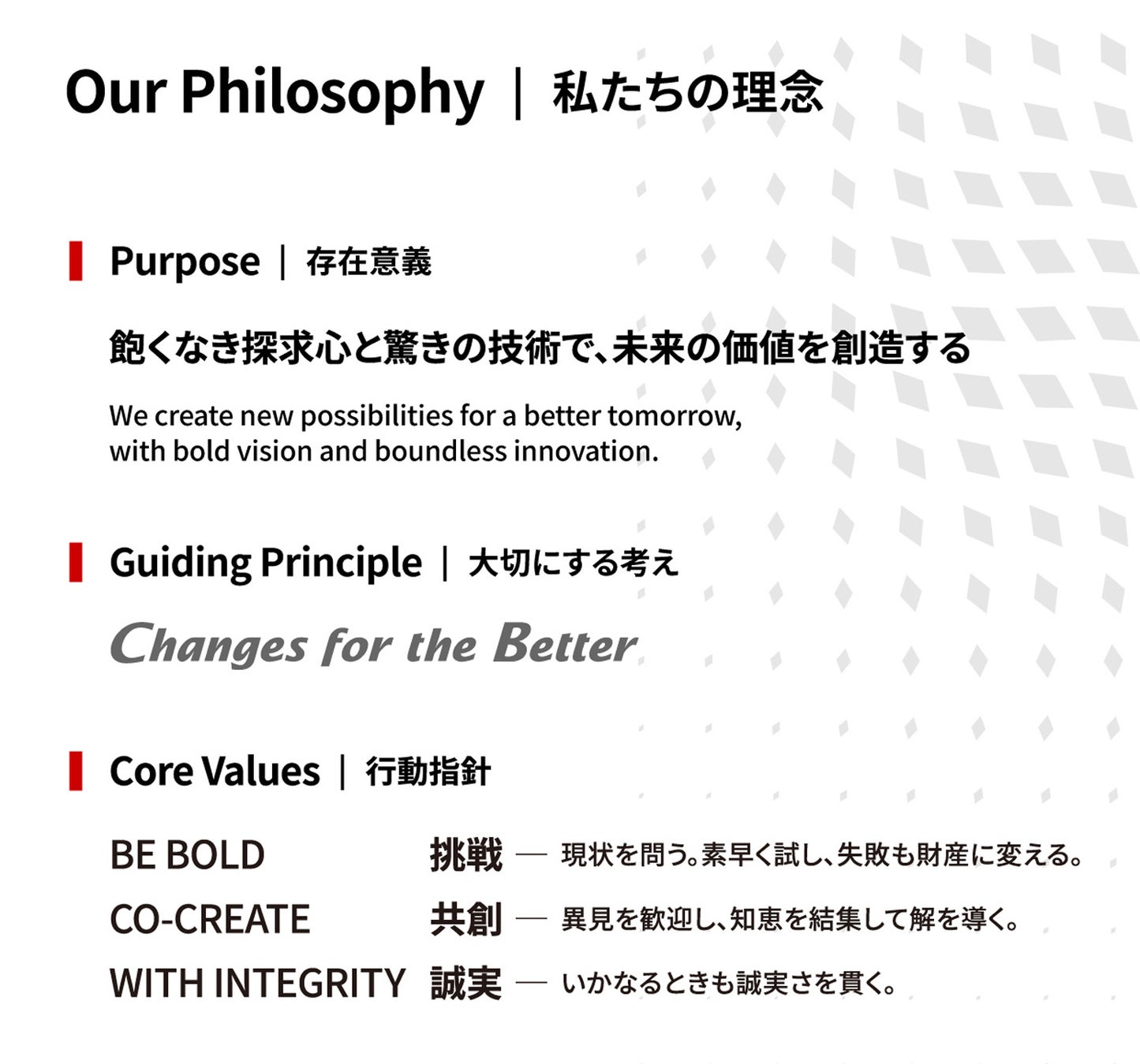 今後のさらなる発展に向け、急速に変化する社会動向や事業環境へ対応していくためには、これまで以上に柔軟で迅速な判断が求められます。そこで、三菱電機グループの従業員一人ひとりが判断に迷った際、次の一歩を踏み出すときのよりどころとなる新たな理念「Our Philosophy」を制定し、その構成要素として「Purpose(存在意義)」「Guiding Principle(大切にする考え)」「Core Values(行動指針)」の3つを定めました。