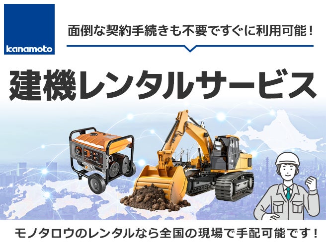 モノタロウの建機レンタルサービスは、ECサイト モノタロウに会員登録するだけで、追加の契約手続きなく利用可能です。本サービスでは、建機レンタル業界大手の株式会社カナモト(本社:札幌市中央区、代表取締役社長:金本 哲男、以下、カナモト)と提携し、建機を中心に多種多様な商品がレンタル可能です。専門スタッフが商品選定のサポートから納品場所や納品日についてお客様と個別に打ち合わせを行い、最適な機材をスムーズにご提供します。