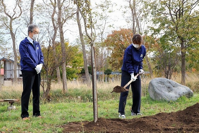増毛町の堀雅志町長をはじめ約30名が参列した暑寒公園での植樹祭当日、アートネイチャーからはSDGs担当役員の常務取締役の内藤功とTVCMで増毛を担当したスタイリストの髙村良佳が出席。内藤は「10月1日からTVCMが放映され、大きな反響をいただいております。これも撮影にご協力いただいた増毛町の皆さまのおかげと感謝しております。本日はお礼の気持ちを込めて、桜を植えさせていただきます」とあいさつし、髙村と地元住民と共に桜の植樹を行いました。