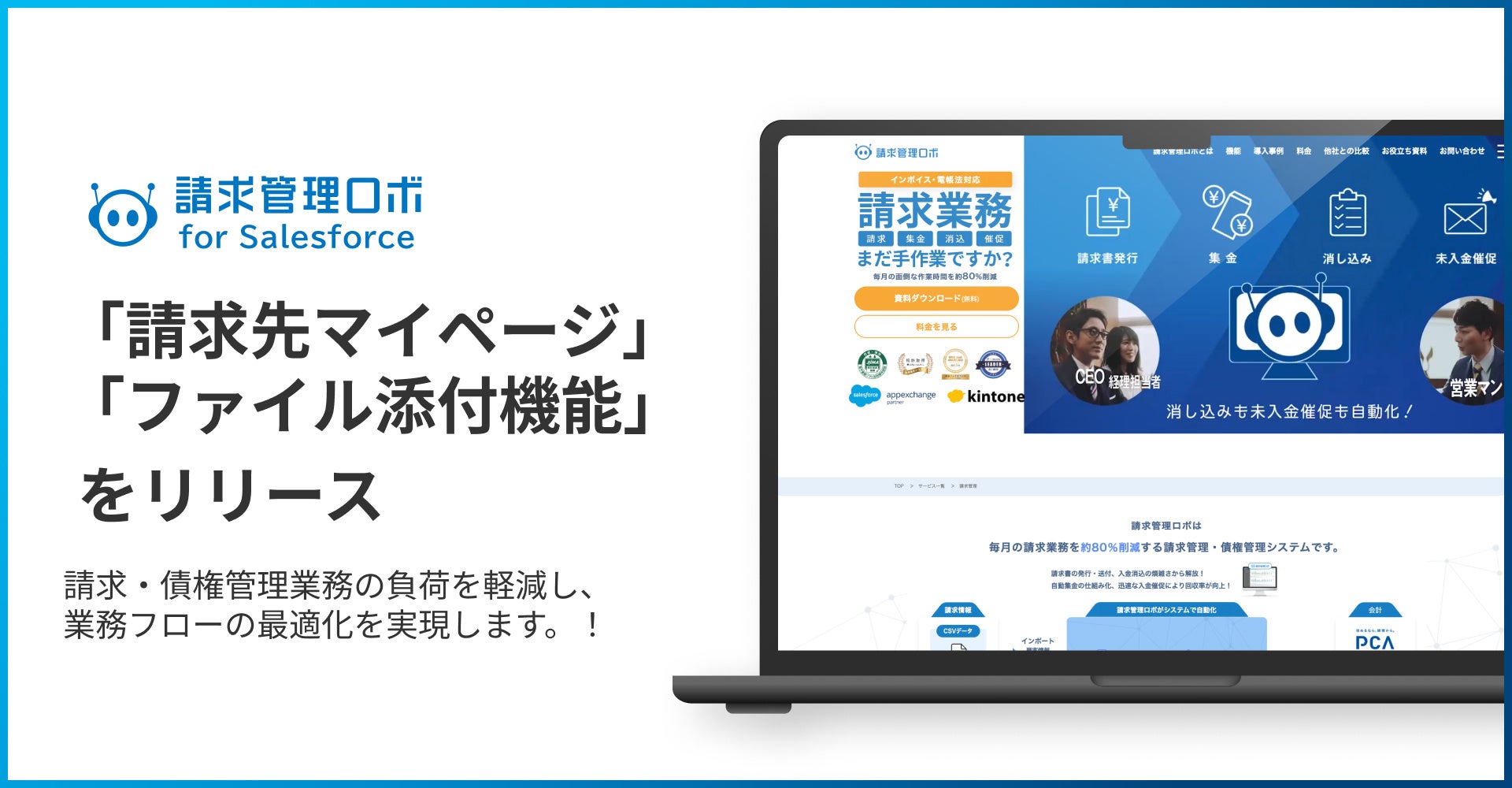 株式会社ROBOT PAYMENT(本社:東京都渋谷区、代表取締役:清久 健也、証券コード:4374、以下「ROBOT PAYMENT」)は、請求・債権管理システム「請求管理ロボ for Salesforce」にて、オプション機能「請求先マイページ」と「ファイル添付機能」の提供を開始します。これにより、Salesforce®をご利用中の企業もこれらの機能を活用できるようになり、請求・債権管理業務の負荷を軽減し、業務フローの最適化を実現します。