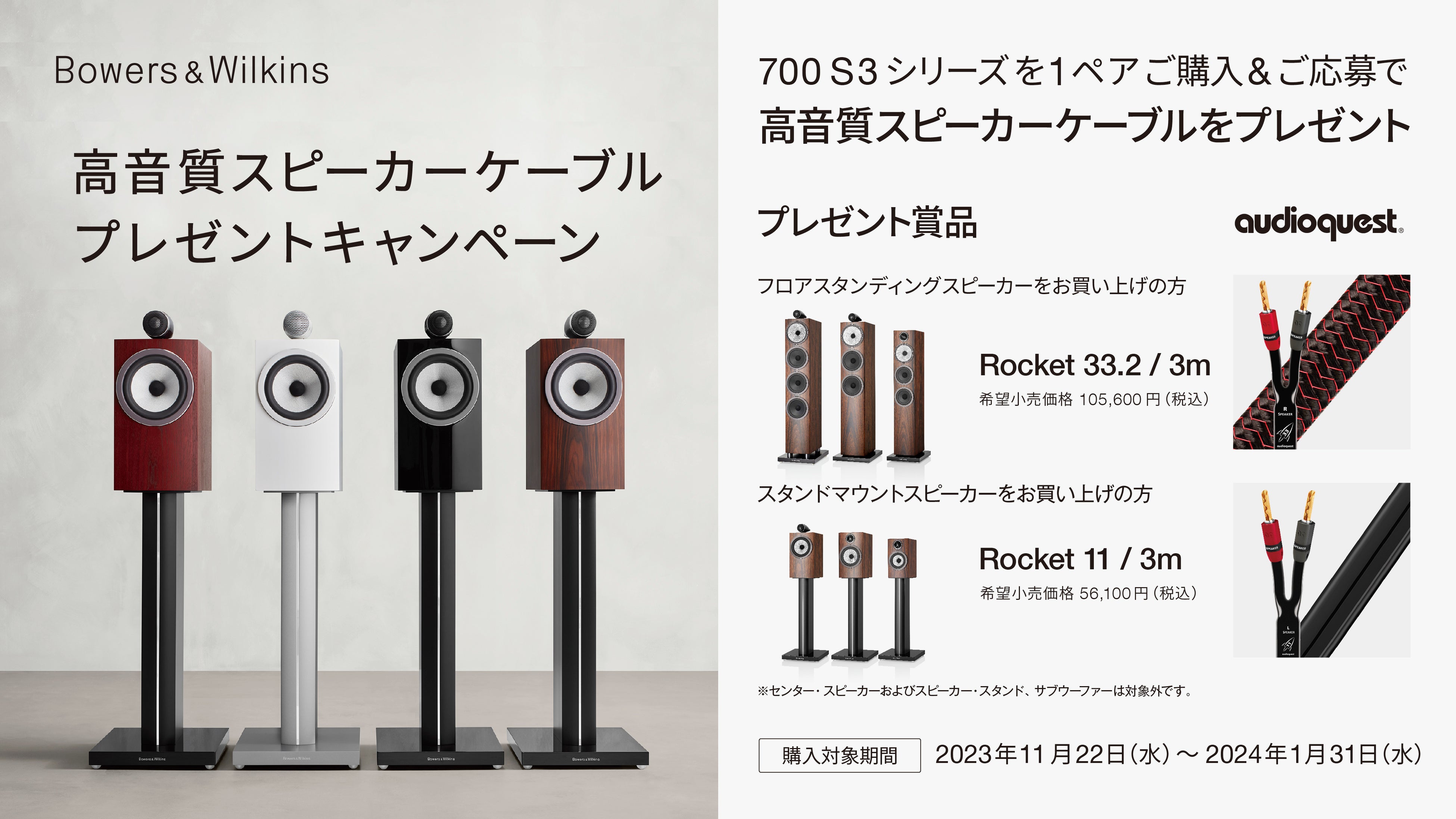 対象購入期間中に700 S3シリーズのステレオスピーカー(1組)をご購入の上、ご応募いただいた方全員に、AudioQuestの高音質スピーカーケーブル「Rocketシリーズ」の「Rocket 33.2」または「Rocket 11」(3m / ペア / シングルバイワイヤ / 金メッキバナナプラグ仕様)をプレゼントいたします。