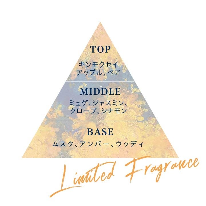 トップノートには、キンモクセイ、アップル、ペアといった華やかな香り、時間の経過とともにジャスミン、クローブ、シナモンといった爽やかかつ奥行きのある香りが広がります。